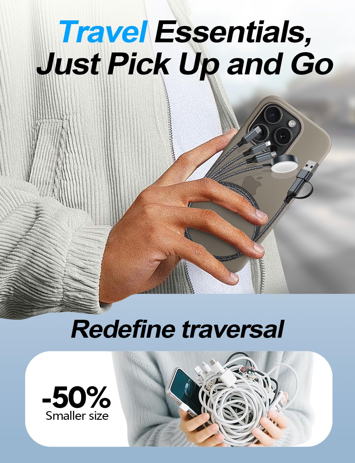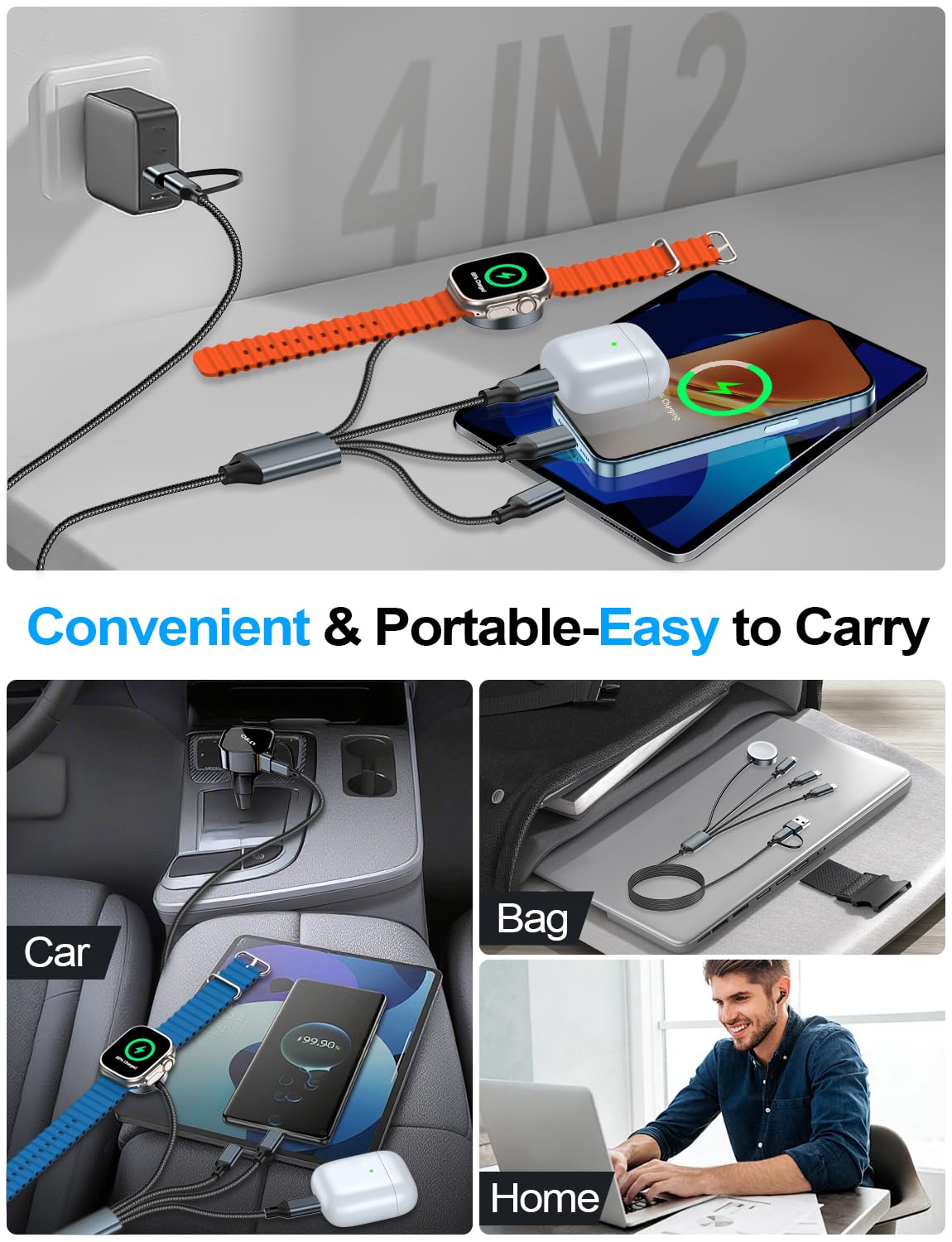- 【Travel Essentials & Convenient】This 4-in-2 Type C/USB A cable is a travel essential and convenient to carry around with lightweight.Use this portable charging cable compatible with Apple Watch/iPhone and Samsung devices on flights, in cars, or with power banks–suitable for home, office, and travel accessories.It fits in your travel bag smoothly take it on the go, just charging your Apple watch/iPhone/Samsung or any other devices at anytime.