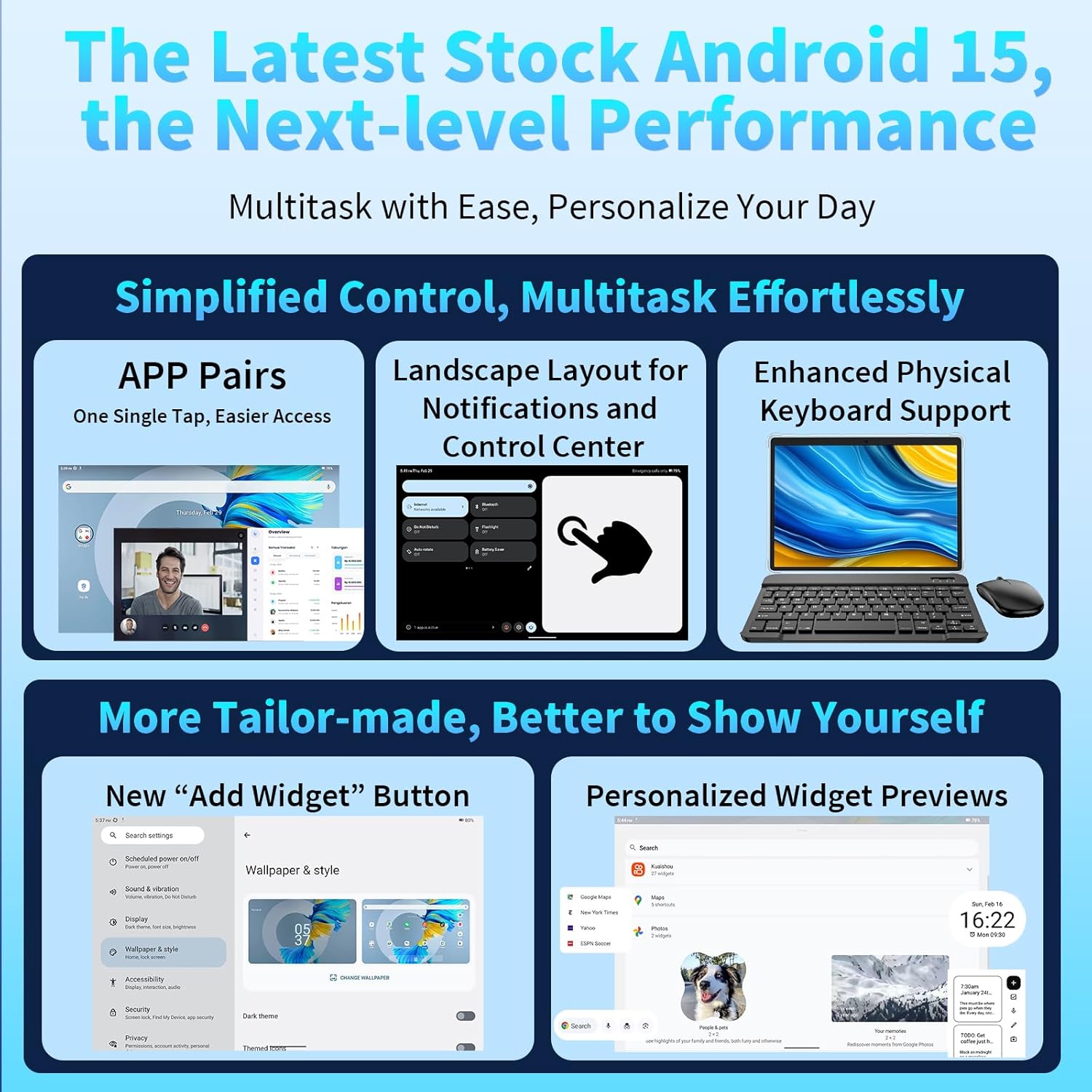 - 【Android 15.0 tablet】 Tablet adopts the 2025 latest version of Android 15.0 system and has passed Google GMS certification, The android 15 tablets offer personalized security systems, lightning fast application launches, super smooth gaming, and stunning netflix multimedia experiences.