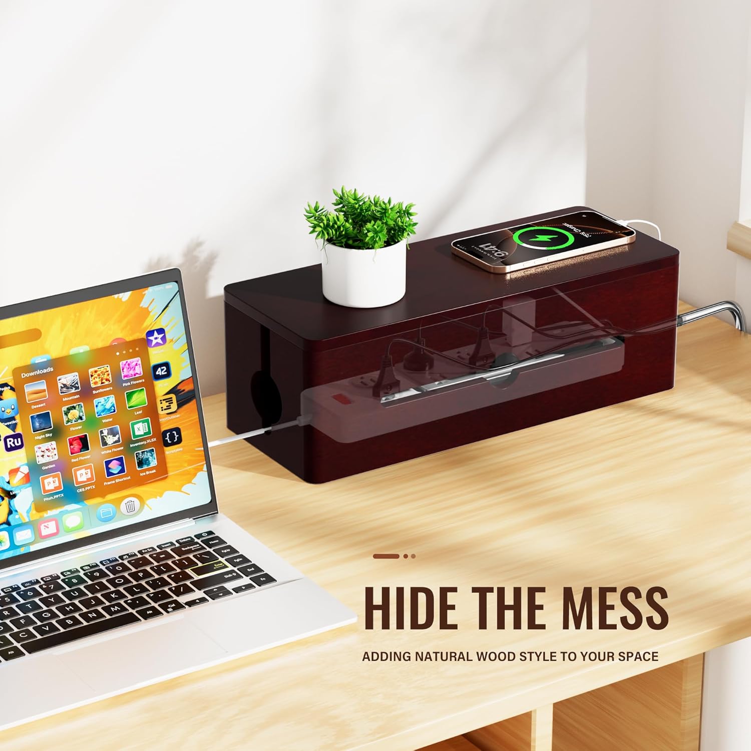 - MAXIMIZE YOUR SPACE: Free up valuable desk/floor space with our wall mounted cord hider box!Simply attach the included heavy-duty mounting hooks to any wall, and effortlessly hang the wooden cable management box.Perfect behind desks, under TVs, or by beds—keeping cords hidden yet accessible for a cleaner, organized space.