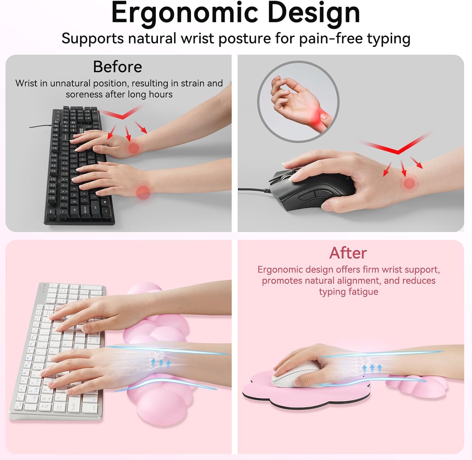 - Non-Slip Silicone Base for Steady Use: The keyboard wrist pad and mouse wrist pad feature silicone bases that grip the desk surface to prevent shifting during typing or gaming. Designed to stay put through daily use, they offer a smoother, more focused workflow without constant readjustment