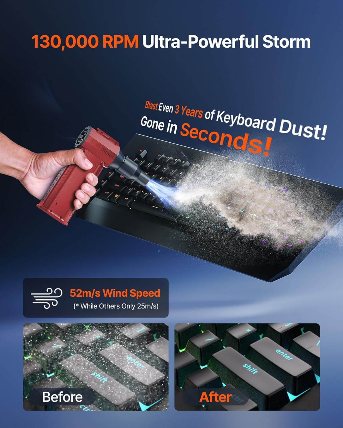 - [130K RPM Cleaning Storm] Our compressed air duster features a 2X ultra-powerful brushless motor, delivering 52 m/s airflow, to blast even 3-year dust from keyboards in 10 seconds.