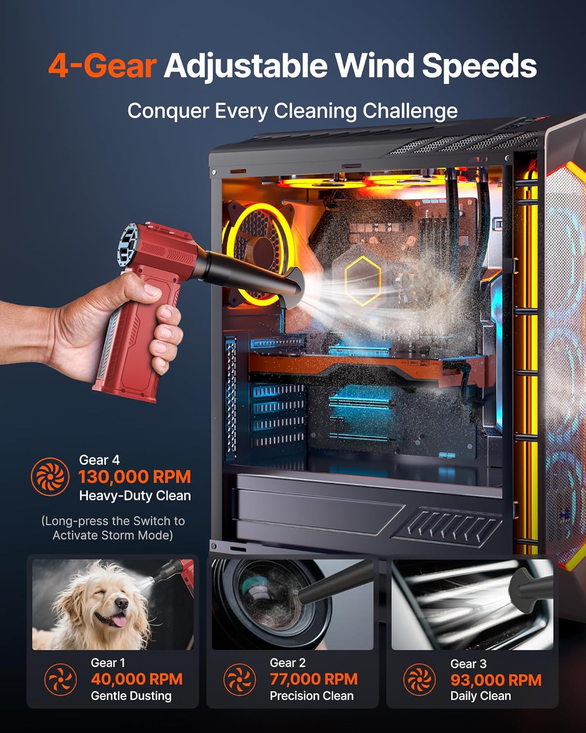 - [4-Gear Adjustable Wind Speeds] Conquer every cleaning challenge. Level 1 for gentle dusting; Level 2 for precision clean; Gear 3 for daily clean; Gear 4 for heavy-duty clean (PS: long-press to activate storm mode.)