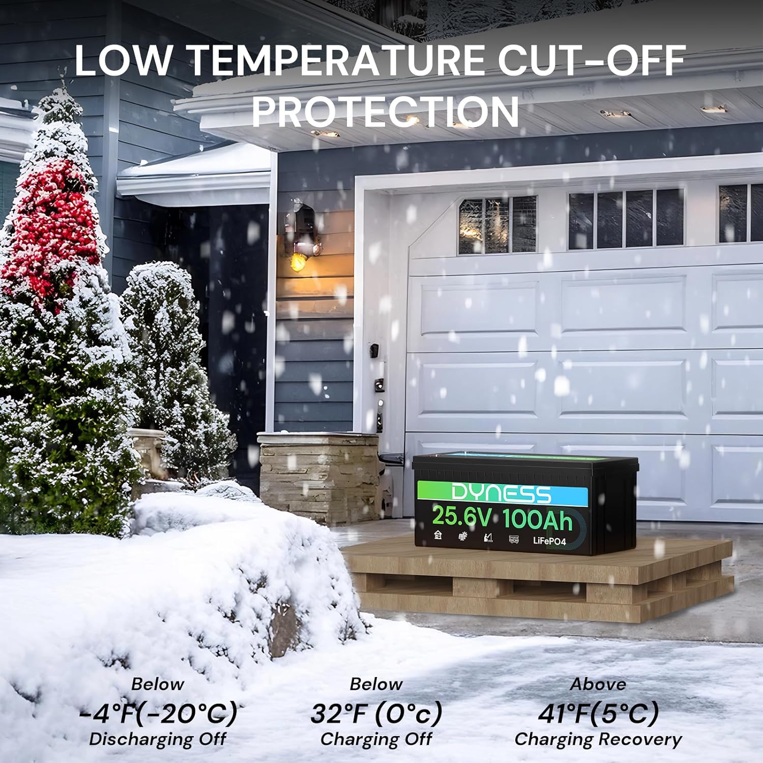 - 【Protect Your Battery in Extreme Cold Environments】 All-New-Design – Automotive low-temperature cut off protection feature automatically disconnects charging when the Dyness 24V 100Ah LiFePO4 Battery's temperature drops below 32°F (0°C), with charging resuming at 41°F (5°C). Additionally, it automatically cuts off power at -4°F (-20°C) to further safeguard the battery