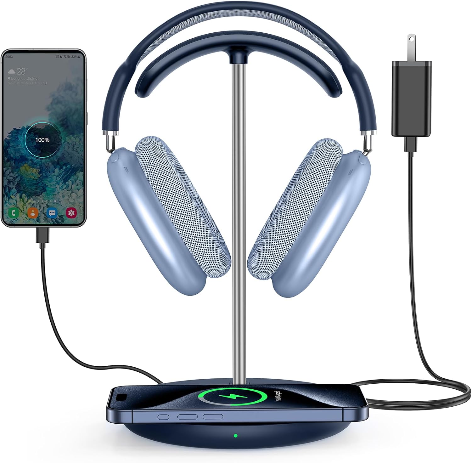 - 【Max 15W Fast Qi Wireless Charging】 This wireless charging station headset holder provides up to 15W fast charging, 15W/10W fast charging for Samsung S23/S22/S21/S20/S10/S9/S8/S7/Note 9/8 series, 7.5W fast charging for iPhone 17/16/15/14/13/12/11/SE/X/8 series, 5W fast charging for Airpods Pro 2nd/Pro/3rd/2rd, 2.5W fast charging for iWatch 9/8/7/6/SE/5/4/3/2/1 and other Qi-enabled devices.