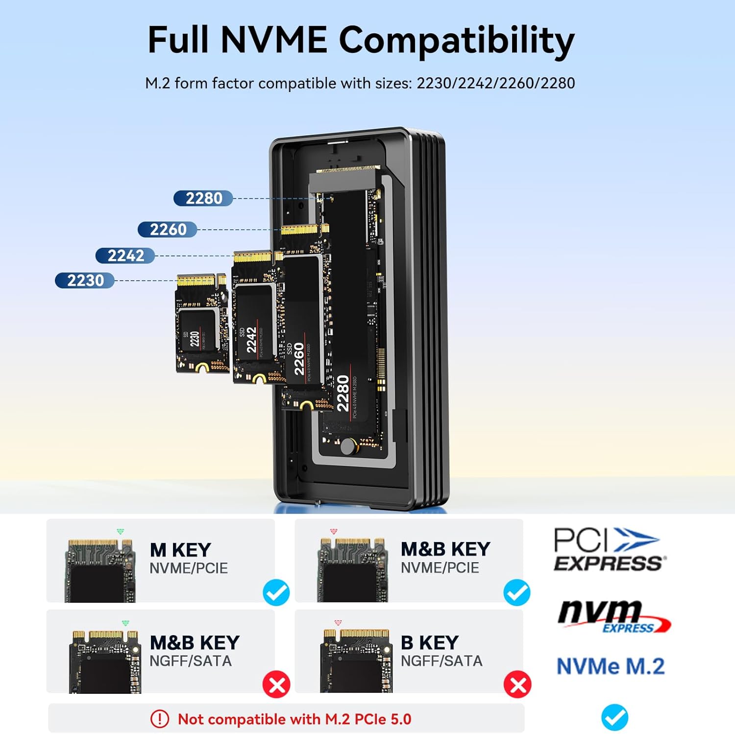 - 【Universal Compatibility】The M.2 NVMe SSD Enclosure is compatible with Thunderbolt 3/4/5 /USB4/3.2/3.1/3.0, ensuring seamless connection on a variety of devices. In addition, this ssd enclosure is compatible with the following sizes: 2230/2242/2260/2280 SSD (Note: Not compatible with M.2 NVMe to PCIe adapters for connecting PCIe devices).