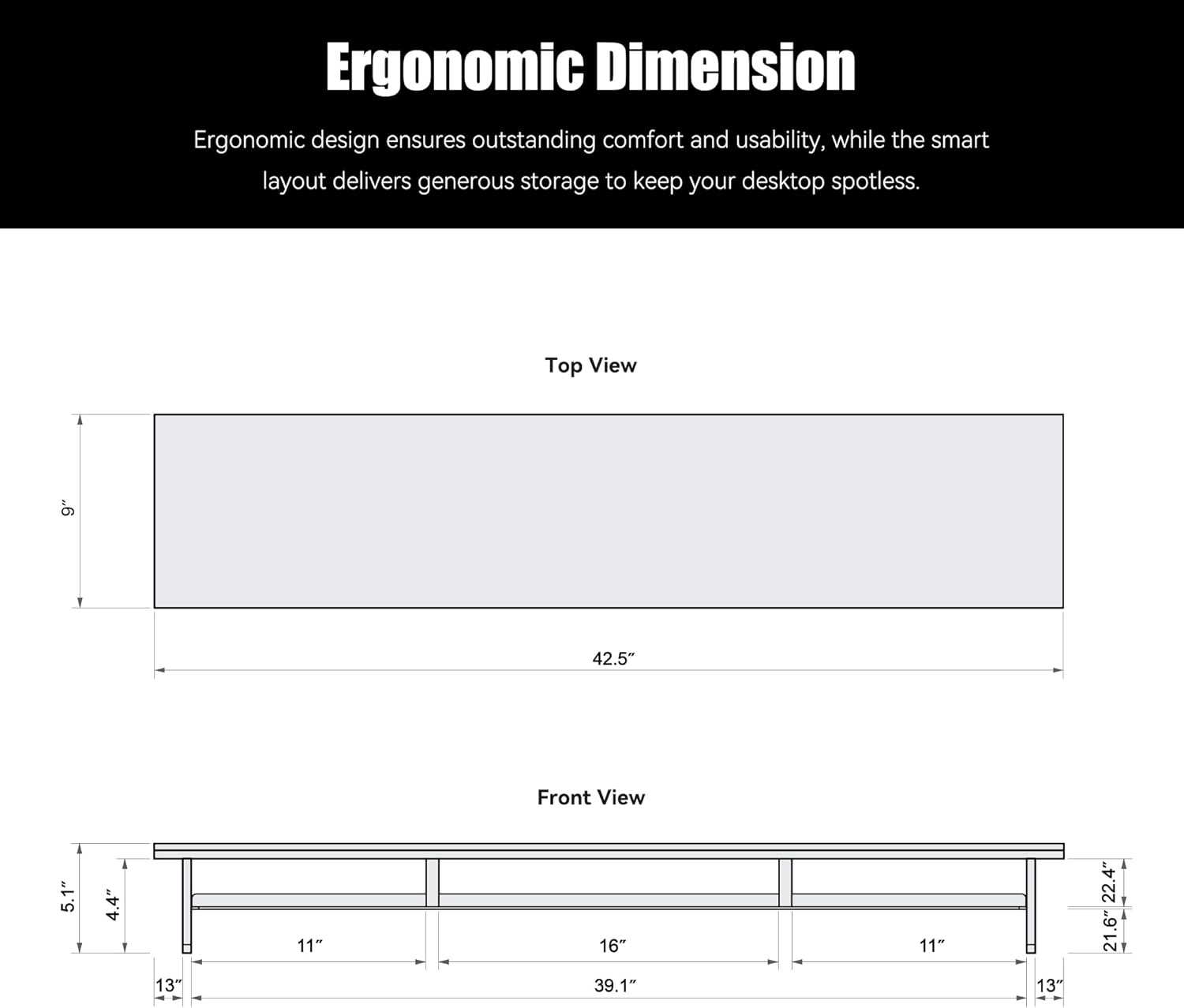 - Rock-Solid Stability:42.5 × 9.3 × 4.7 in overall size, 0.7 in / 18 mm thick panels, full-length steel core. 0.31 in / 8 mm premium acrylic legs deliver a 99 lb / 45 kg load capacity—effortlessly supporting heavy monitors or large laptops.