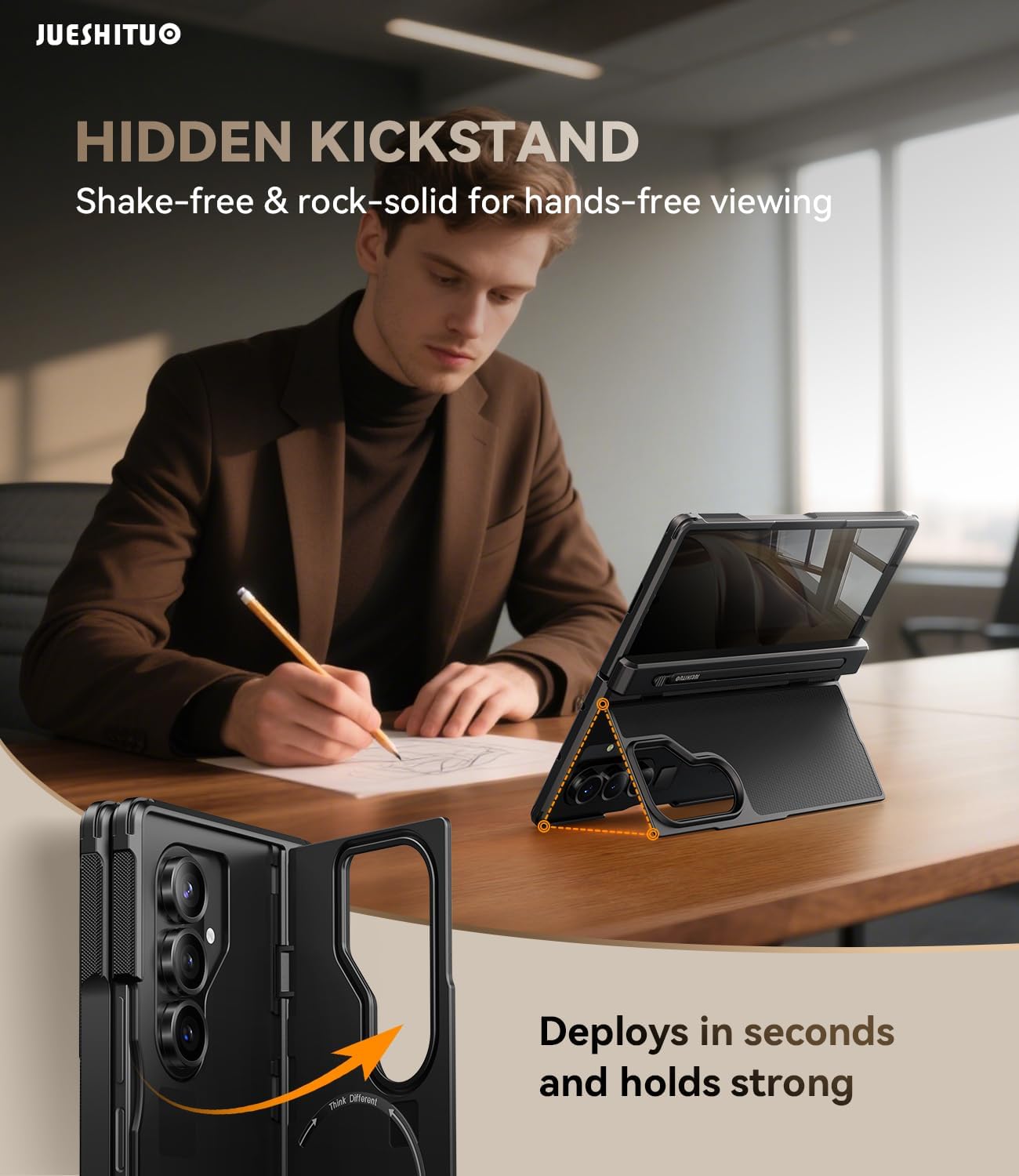 JUESHITUO for Samsung Galaxy Z Fold 7 Case with Privacy Screen Protector, Built-in S Pen Slot(No Pen) & MagSafe, Military Shockproof Cover for Z Fold 7, Hidden Kickstand, Hinge Protection, Black