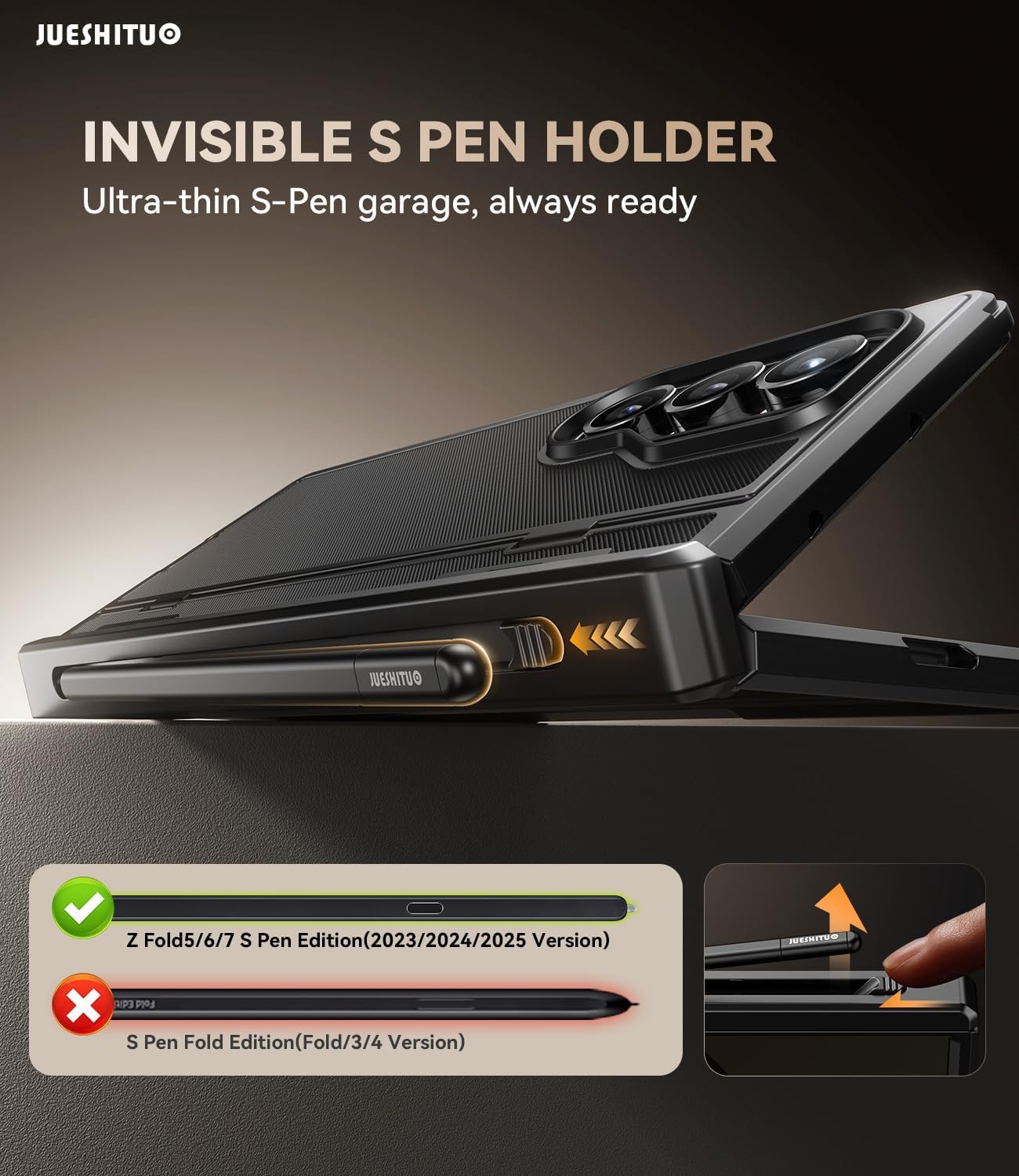 - Smart S Pen Holder & Quick Access: The samsung galaxy z fold 7 case integrates a spring-loaded pen slot. Press to eject, auto-retracts when removed. Non-slip base secures Z Fold 5/6/7 pens (not included)