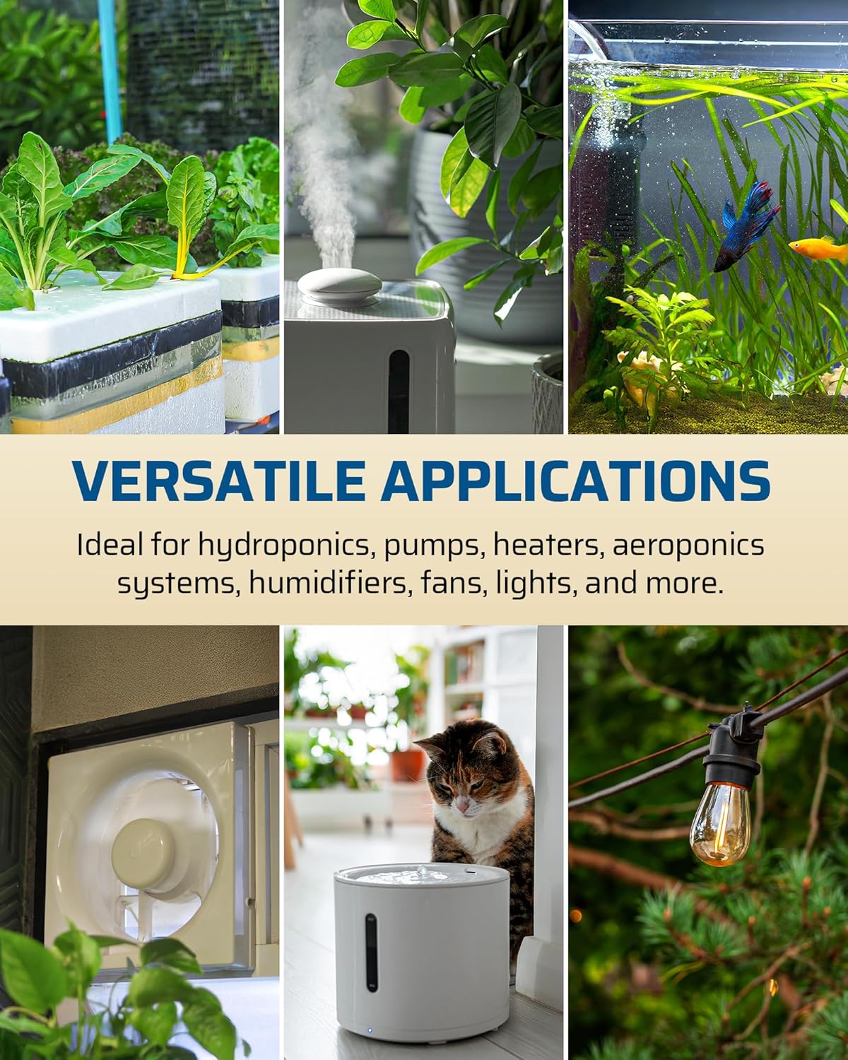 - [Wide Application] Just set ON/OFF durations and choose your mode; the digital repeat cycle timer is ideal for humidifiers, ventilation fans, pumps, heaters, sprinklers, aquaponics, aeroponics, hydroponics systems, and more—making automation easier than ever