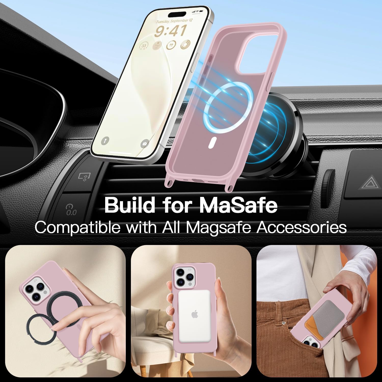 for iPhone 15 Pro Max Case with Lanyard [Compatible with MagSafe], Crossbody Phone Case with Neck Strap Adjustable, Magnetic Phone Cover for iPhone 15 Pro Max 6.7'' Pink