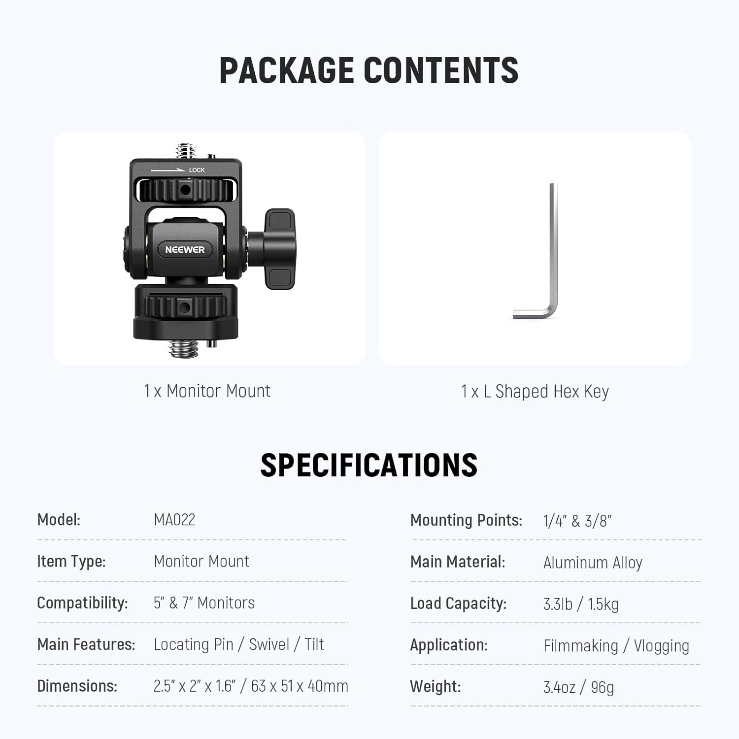 - 【Stable & Flexible Camera Monitor Mount】 Securely attach a monitor to your camera via the camera monitor mount. The ingenious structural design allows for quick angle adjustments, while the built in thrust bearings ensure a strong lock on the tightening knob. The design provides ease of use and enhanced safety, preventing accidental drops during your shoot