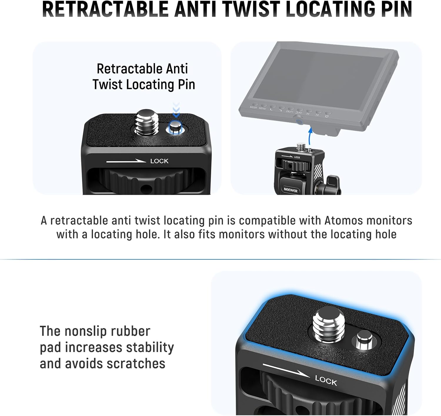 - 【Retractable Anti Twist Locating Pin】 A retractable anti twist locating pin is compatible with Atomos Ninja V Ninja V+ and other monitors with a locating hole, or NEEWER F100 F700 monitors without a locating hole. The nonslip rubber pad adds stability and prevents scratches