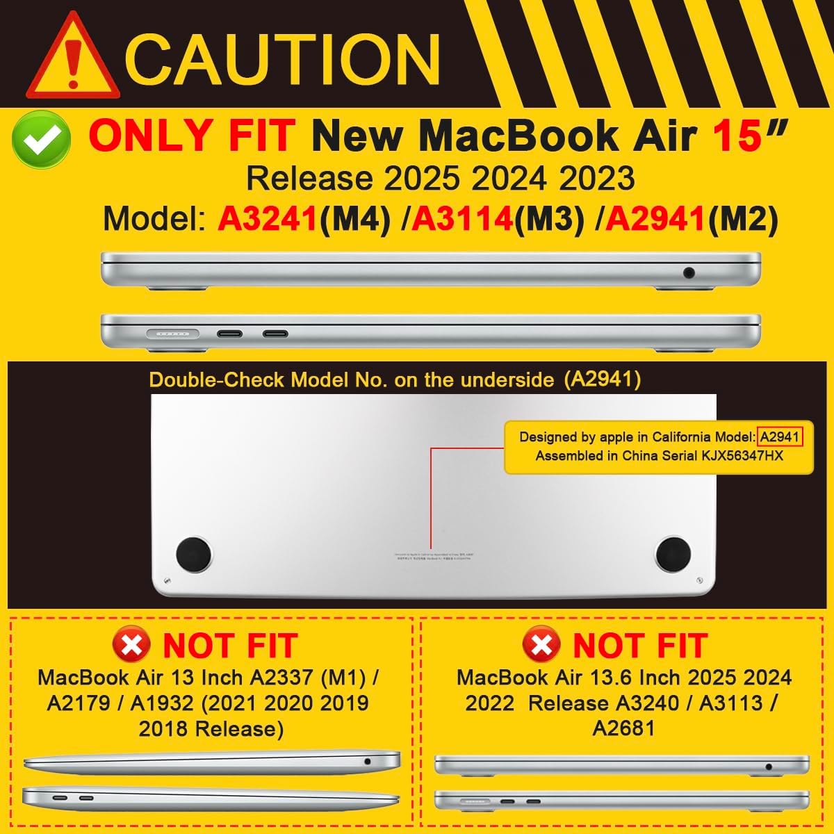 - Case Only Compatible for New MacBook Air 15.3-inch (diagonal) 2025 2024 2023 release with M4/M3/M2 Chip Model number:A3241/A3114/A2941.Note: different models correspond to different case,please check the model carefully before order