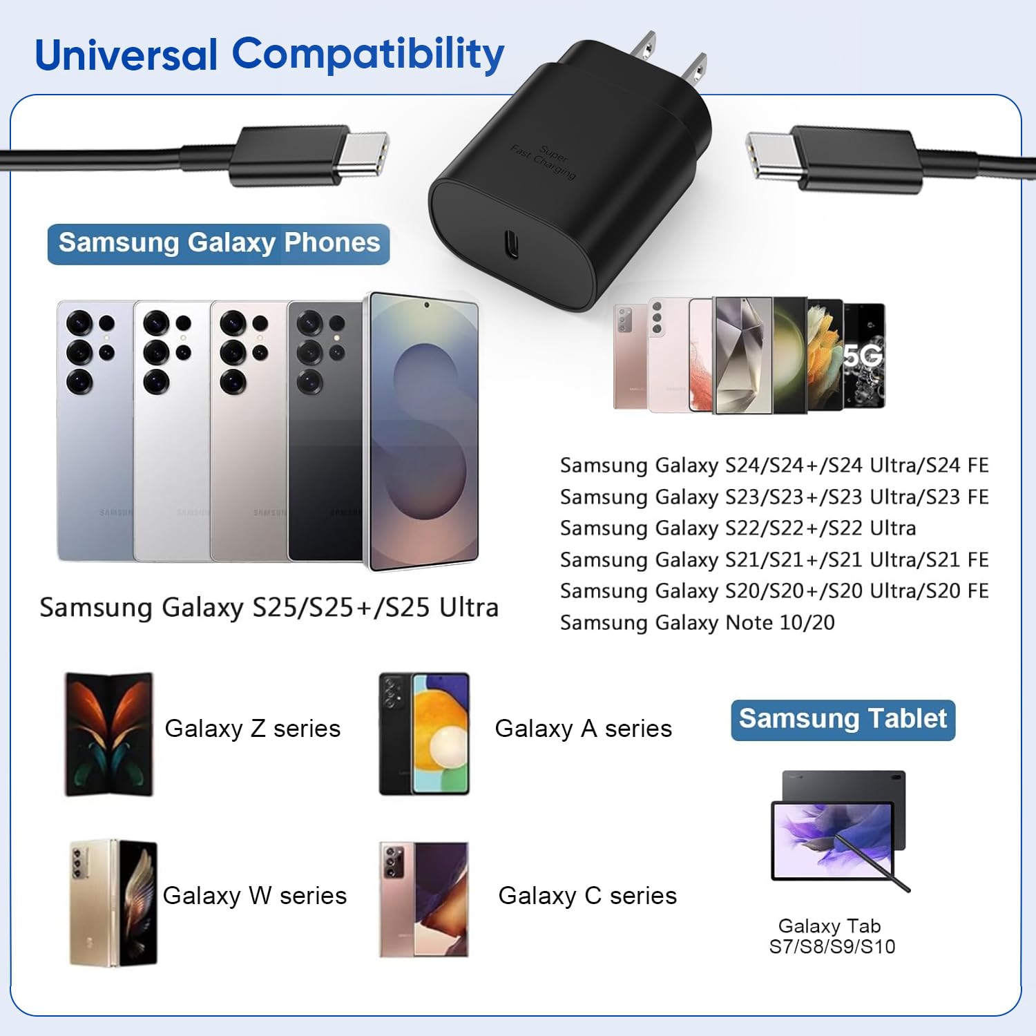 - 【Compatible Models】25W Fast Charger for Samsung Galaxy S25 Edge/S25+/S25/S25 Ultra/S24+/S24/S24 Ultra/S23 FE/S23+/S23/S23 Ultra/S22+/S22/S22 Ultra/S21+/S21 FE/S21/S21 Ultra/S20+/S20/S20 Ultra, Galaxy Z series, Galaxy A series, Galaxy C series, Samsung W and more USB c devices.