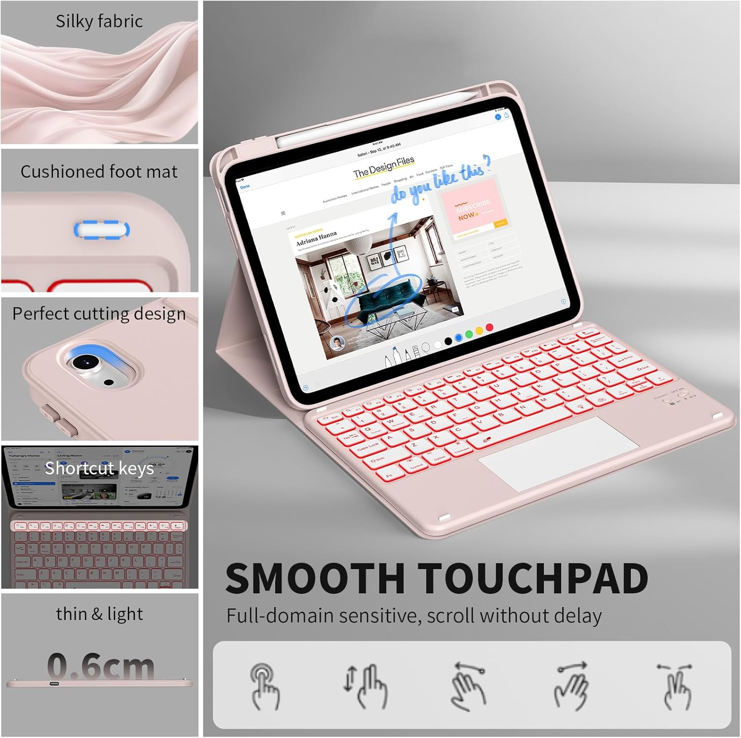 JKSML for iPad(A16) 11th/10th Generation Case with Keyboard (11/10.9 inch) 2025/2022, 7 Color Backlight Detachable Bluetooth Cover with Trackpad, Flip Stand Case Thin with Pencil Holder, Baby Pink