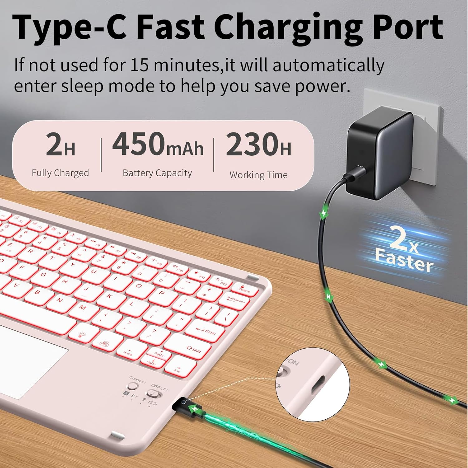 - 【Detachable Magnetic Keyboard with 7-Color Backlight】 Features a wireless Bluetooth keyboard with magnetic attachment/detachment functionality. Customizable 7-color RGB backlight with 3 brightness levels enables comfortable typing in low-light environments.You can choose your favorite color, bringing you different visual enjoyment. Ergonomic and mechanical scissor keys with rebound feature to reduce noise, enjoy comfortable typing even long hours
