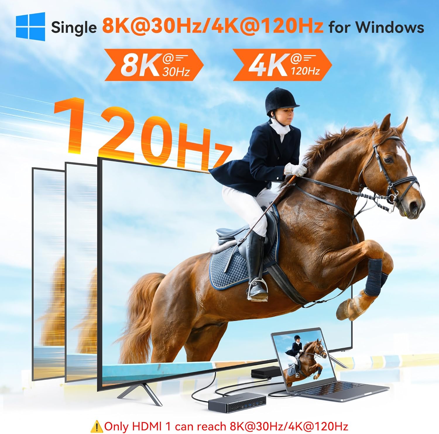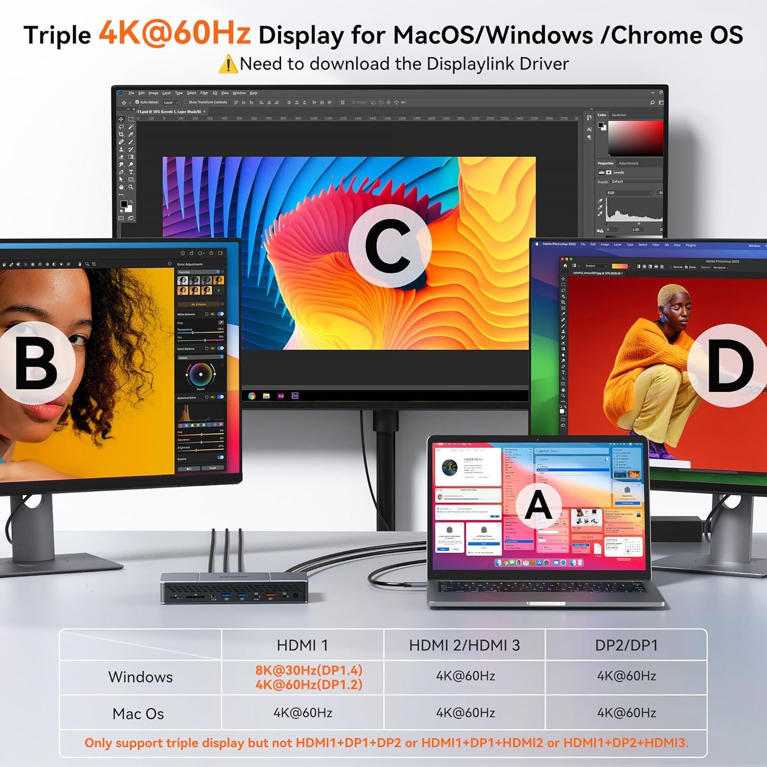 - Triple/Dual 4K@60Hz Display Monitors Docking Station: The laptop docking station 3 monitors with 3 HDMI+2 DisplayPort by installing the DisplayLink driver, your MacBook is not limited by the M1/M2/M3/M4 chip, easily enjoy various multi display and up to triple 4K@60Hz display. HDMI1 of the display link adapter max up to 8K@30Hz/4K@120Hz when used alone (only under DP1.4 on Windows), other video output ports must download the displaylink driver to work. Note: Your laptop must support video output