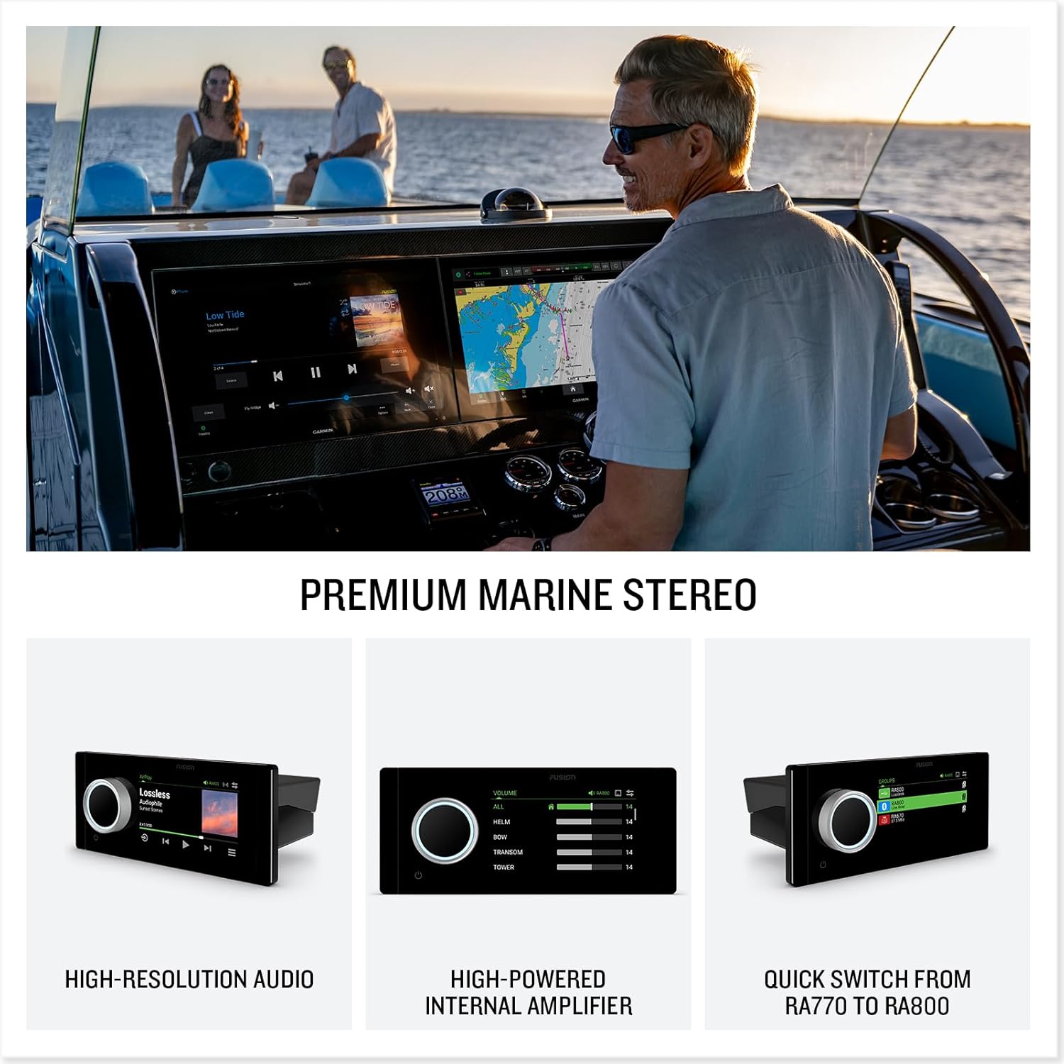- With its sleek, edge-to-edge glass faceplate designed to blend seamlessly with new-generation marine electronics, the Fusion Apollo RA800 marine stereo brings a clean, modern aesthetic to your helm