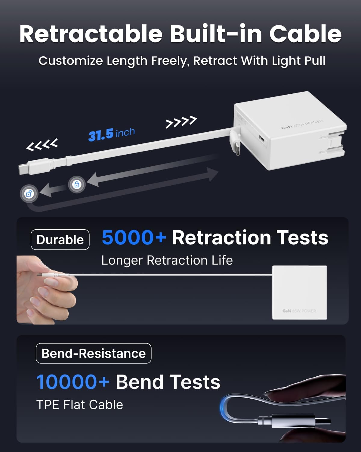 - What You Get: 65W Retractable Charger (Built-In 31.5in type-c cable), User manual, 2 years support. If there is any quality problem, should you encounter any quality issues, please contact us for a prompt solution and lifetime friendly customer service.