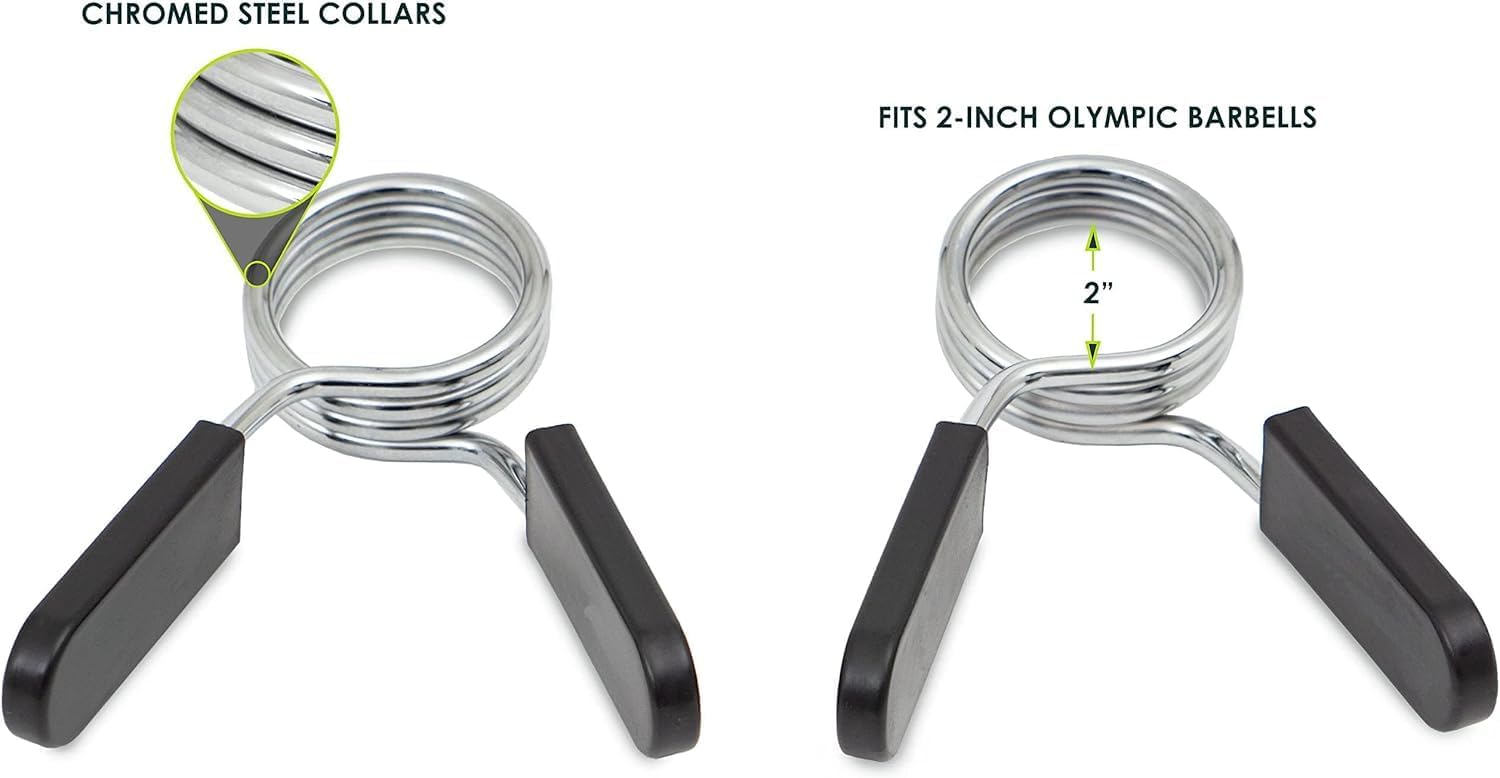 - UNIVERSAL FIT: 2-inch diameter spring collar clips designed to securely lock weights on standard Olympic barbells and dumbbells