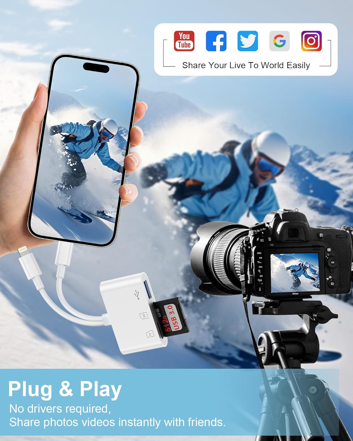 - Plug & Play: No app or software required - just read SD/TF Cards & USB Drives with Ease. This card reader adapter instantly accesses and manages files from SD (SD/SDHC/SDXC), microSD (TF/microSDHC/microSDXC/UHS-I/UHS-II), or USB-A devices like digital cameras, SLRs, USB flash drives, keyboards, mice, and other peripherals. Fully compatible with iOS, Android, Windows, Mac OS, Linux, and most OTG-enabled devices.[Do NOT Support Wi-Fi SD Memory card]