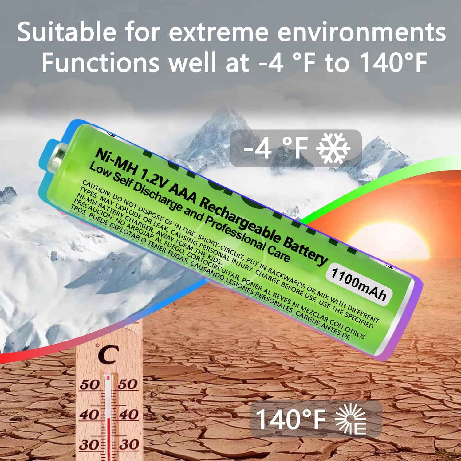 - 【Safety Material】: Ni-MH AAA batteries are made of more environmentally friendly materials than conventional batteries and do not contain Hg/Cd/Pb, which is important for reducing heavy metal load and is more suitable for widespread use in everyday electronic products. such as cordless phones, remote controls, wireless mouse, portable audio players, personal digital assistants (PDA), razors, electric toothbrushes, flashlight, toys and games.