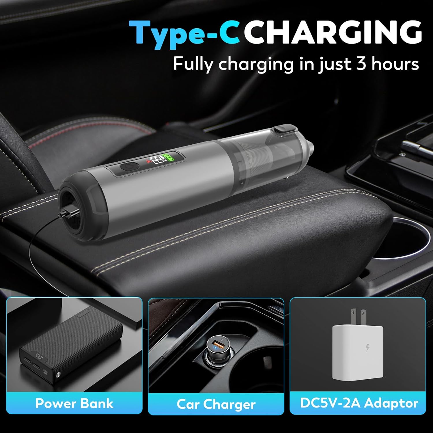 - 【Type-C Charging】Handheld vacuum cordless supports and includes a Type-C charging cable (adapter not included), enabling charging at any USB port—whether in your car or at home. Fully charges in as little as 3 hours and delivers up to 35 minutes of continuous operation (varies by mode)