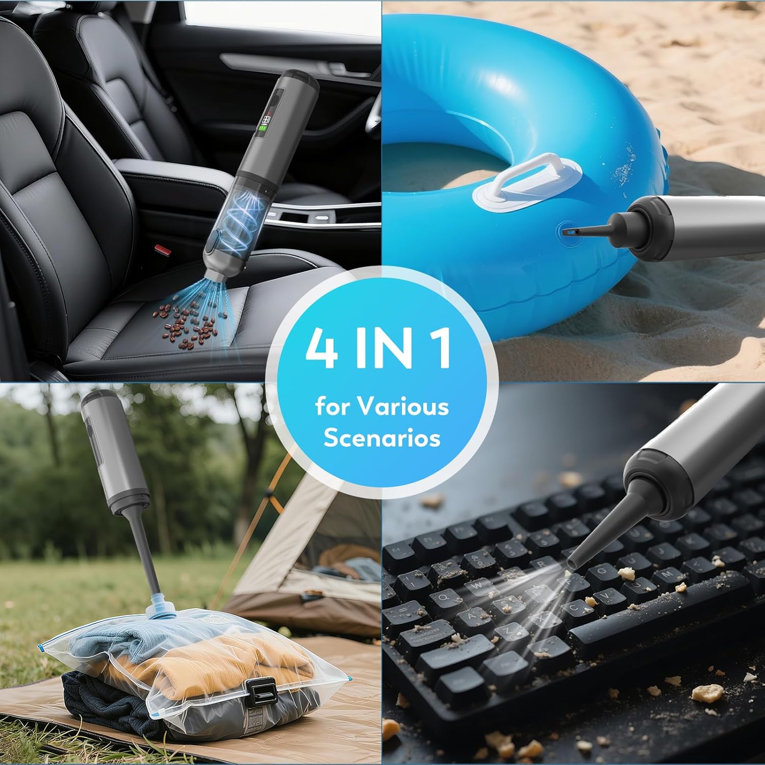 - 【Multi-functional & Multi-scenario】Vacuum cleaner combines suction, blowing, inflating, and deflating capabilities into one device. Equipped with a variety of different nozzle attachments, it meets your diverse needs for use in multiple scenarios—such as sofas, compression bags, computers, and inflatable swim rings—across home, car, and outdoor settings