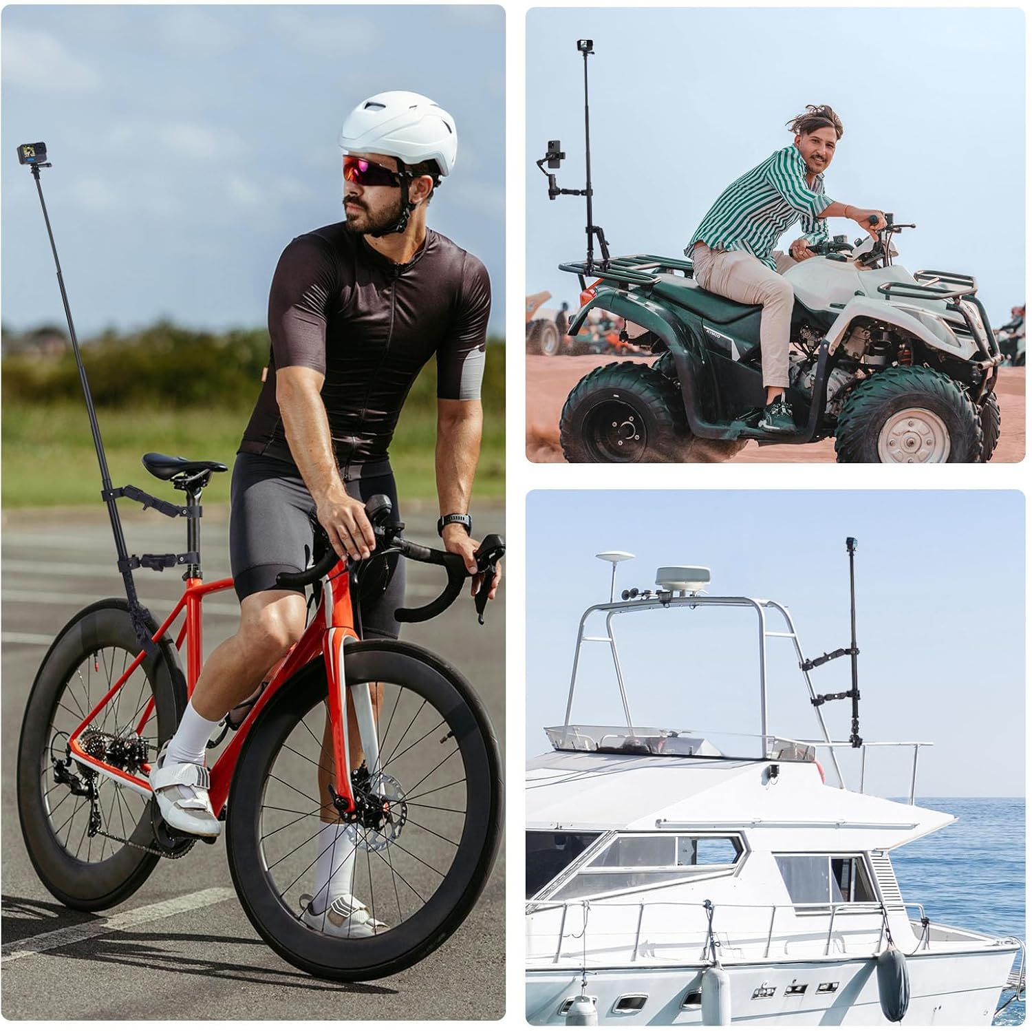 - Modular & Package Includes: 1*59” invisible selfie stick, 5 *heavy-duty clamp mounts, 1* cameras Adapter, 1* 6cm double socket arm,1* 9cm double socket arm , 1* 15cm double socket arm. All components are detachable and can be freely combined for various shooting scenarios, providing versatile and practical accessories for your outdoor activities