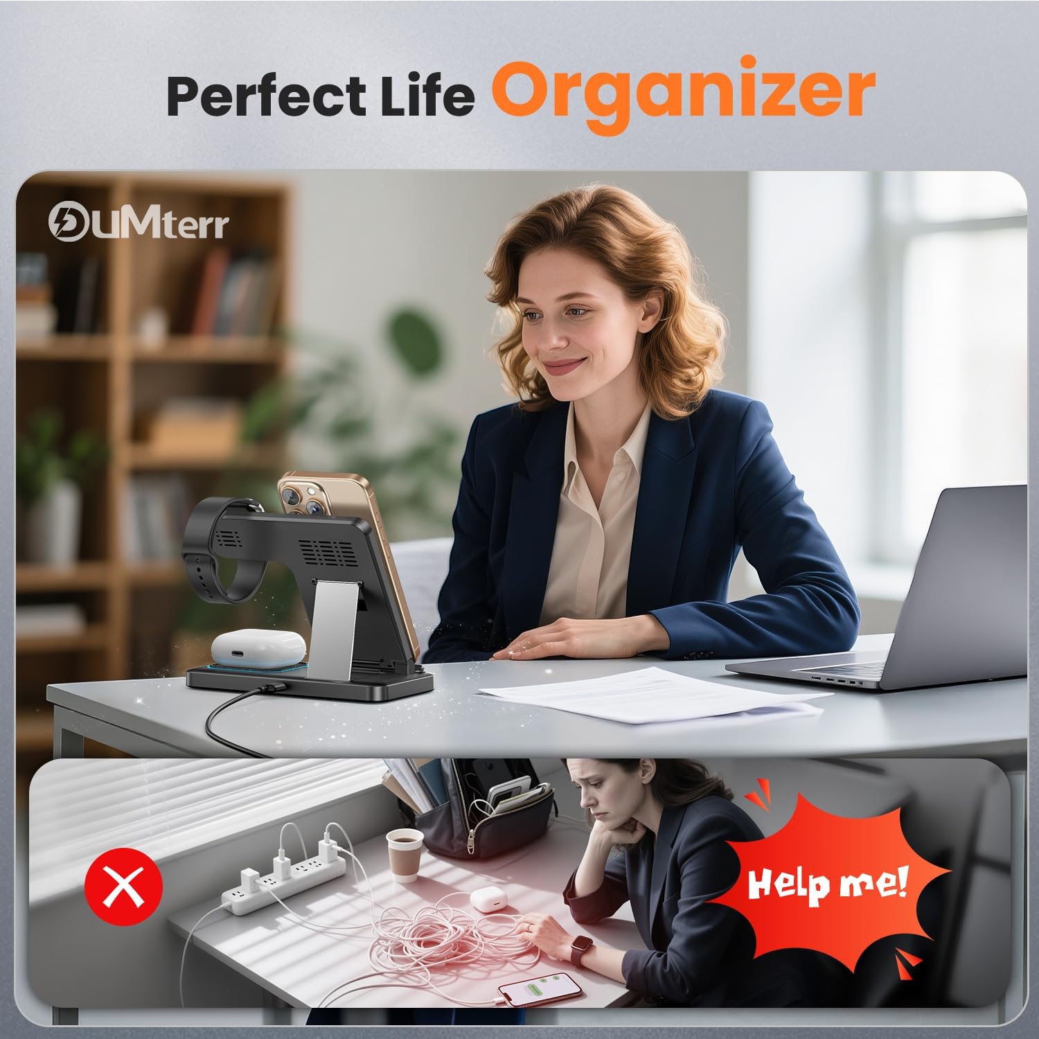 - 【3 in 1 Charging Station for Multiple Devices】Say goodbye to messy cables and enjoy "one-stop" wireless charging! Our DUMTERR 3 in 1 Charging Station for Apple solves the charging needs of all your main devices. Simply place your iPhone, Apple Watch and AirPods (with wireless charging case) on our charging station to start efficient and fast charging at the same time. You will have a tidy desktop!