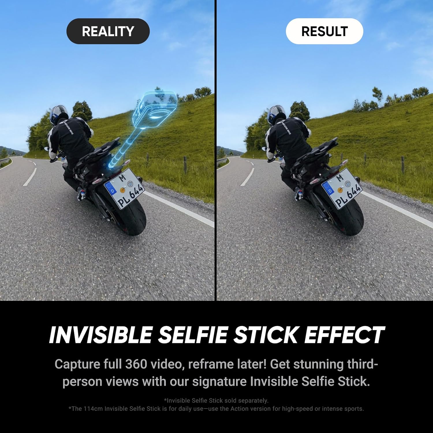 - Invisible Selfie Stick: Create impossible third-person views with no selfie stick in sight! Capture everything in 360, then choose your angles later using AI-assisted reframing—perfect shots, every time. *Invisible Selfie Stick sold separately.
