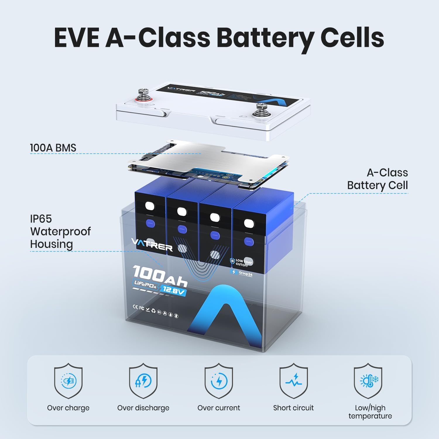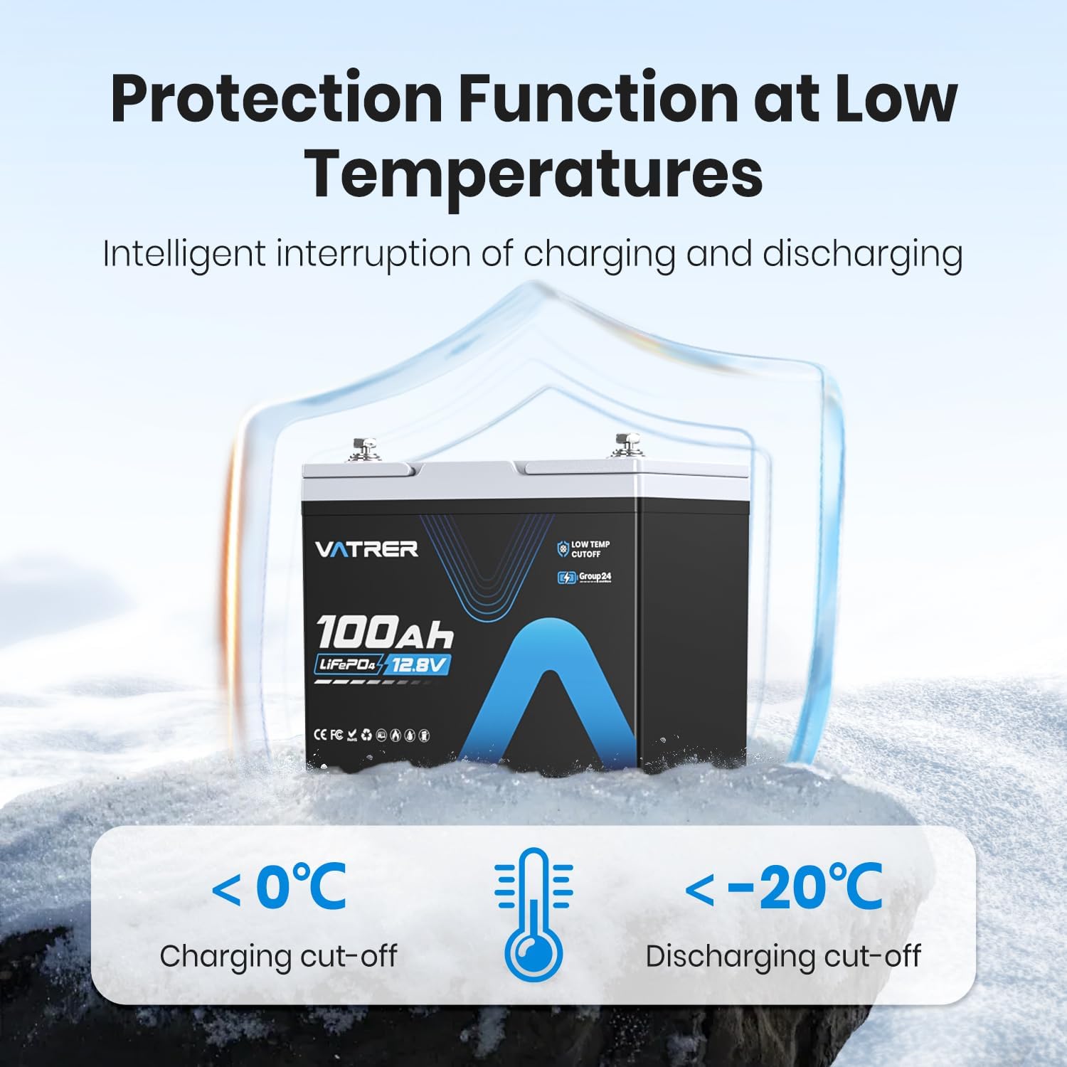 - 【Stable Output and Security】This 12V 100Ah lithium battery delivers excellent stable output and multiple safety protections. Featuring high-energy-density LiFePO4 cells, it supports 100A continuous discharge and provides 1280Wh of stable power output. For optimal storage: batteries stored for less than 3 months should maintain at least 50% capacity, while those stored longer than 3 months should retain at least 80% capacity.