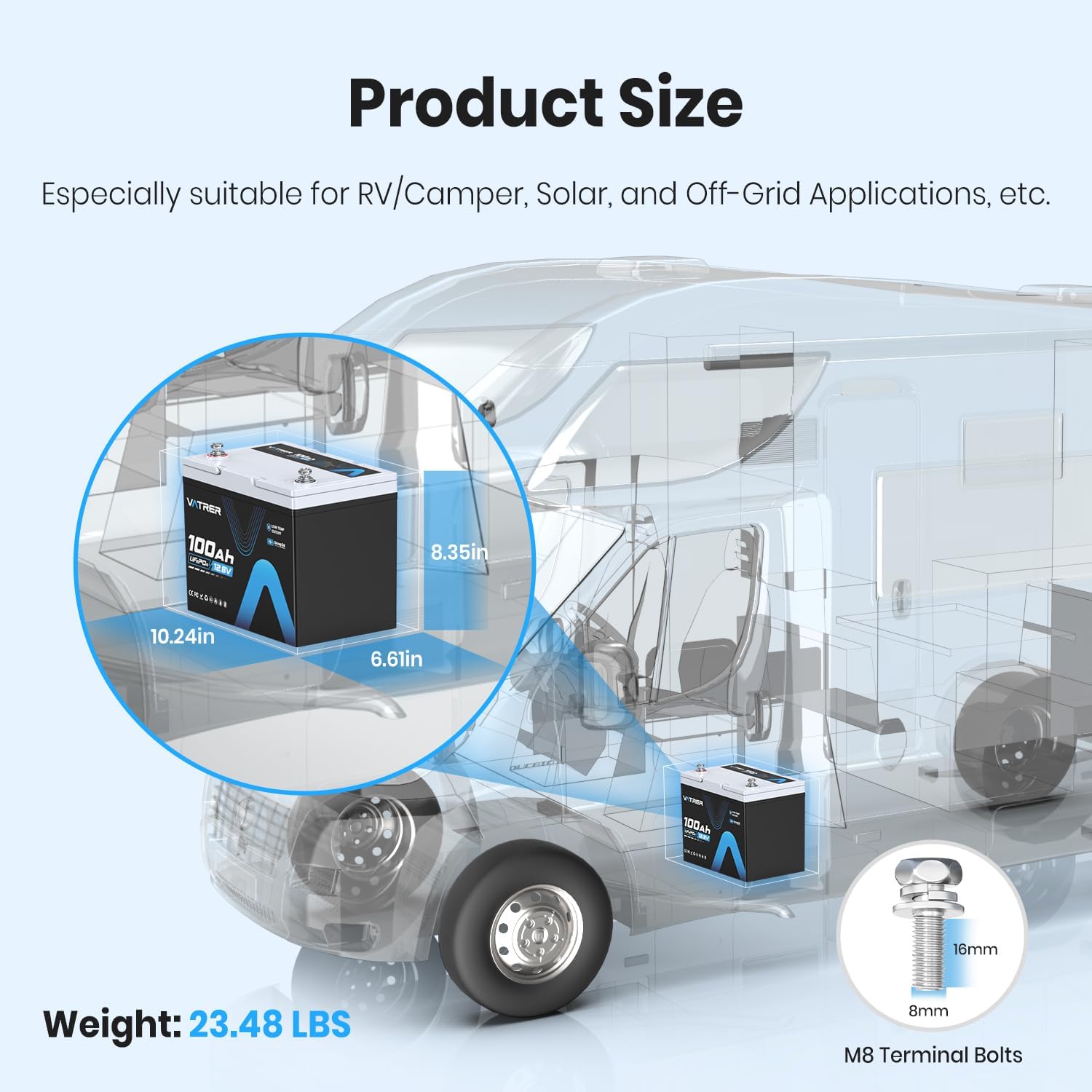 - 【Group 24 Battery Size 】The 12V 100Ah lithium battery has dimensions of 10.24 x 6.61 x 8.35 inches and weighs 23.48 lbs, making it an ideal fit for a Group 24 battery compartment. With a 12V 100Ah capacity, this Group 24 lithium battery offers consistent, high-performance energy delivery. It outlasts traditional lead-acid batteries, providing up to 5000+ deep cycles and reducing the need for frequent replacements.