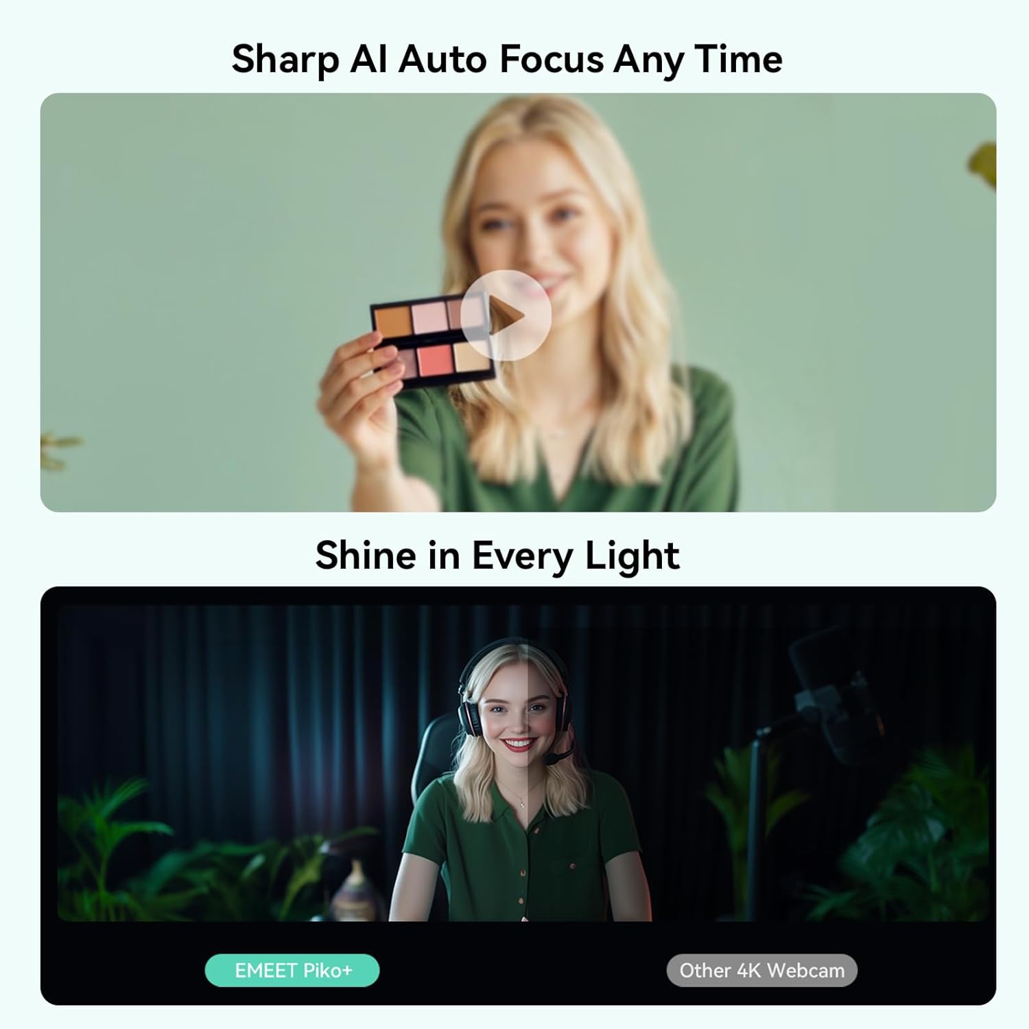 - Visual Excellence, Revolutionary Dual-Camera Innovation - EMEET Piko+, the world's 1st Dual-Camera AI-Powered 4K Webcam, elevates your 4K experience. Its 4K main camera with a 1/2.55'' Sony sensor delivers ultra-clear visuals, while the AI-Assisted camera ensures rapid autofocus and precise face lighting. Piko+ excels in low-light conditions with superior face and background recognition, outperforming competitors and making it the ideal choice for content creators, professionals, and educators.