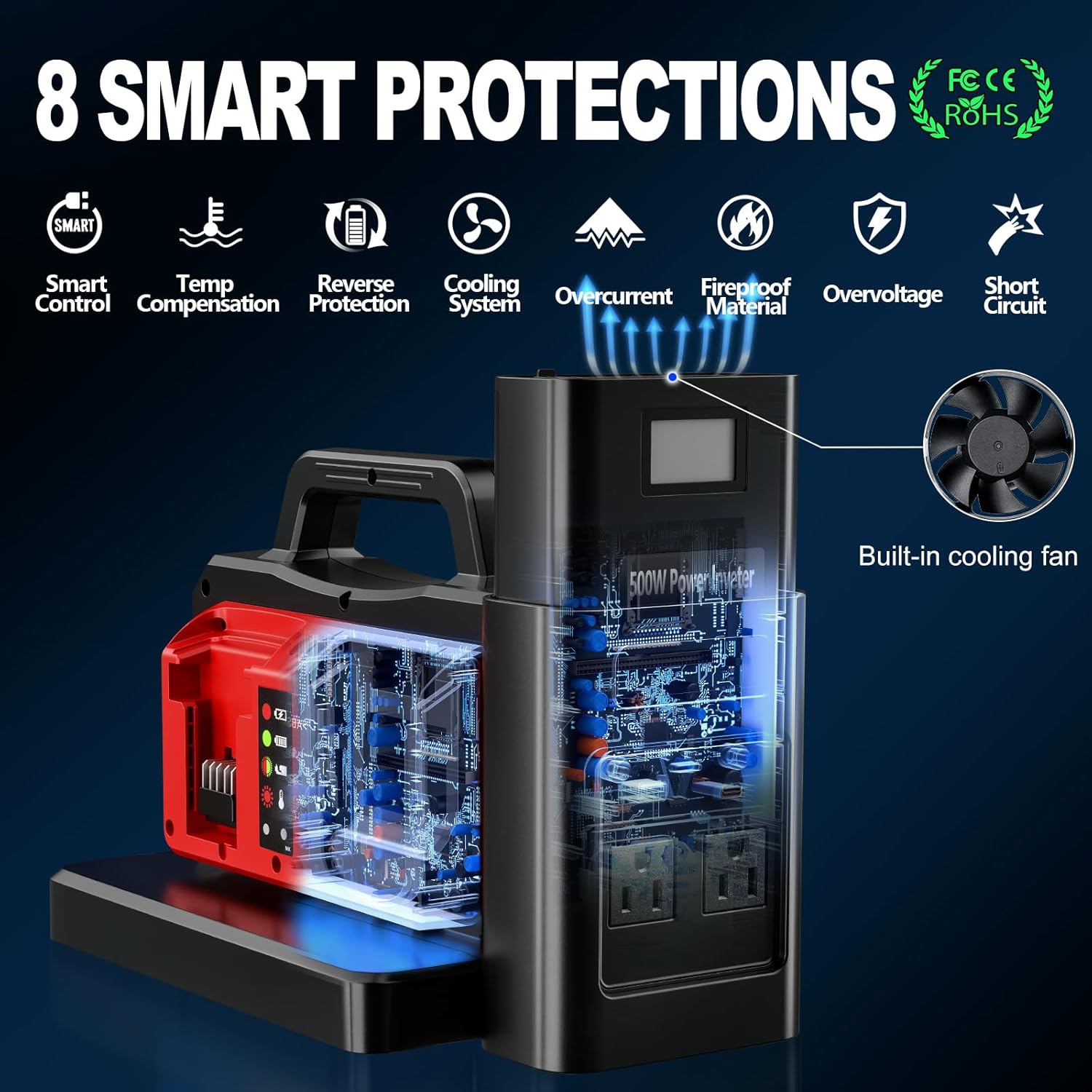 - ⚡Smart 5-in-1 Safety Protection: Over-voltage, overload, short-circuit, overheat, and low-voltage protections ensure risk-free operation. Built-in cooling fan safeguards devices and battery lifespan.