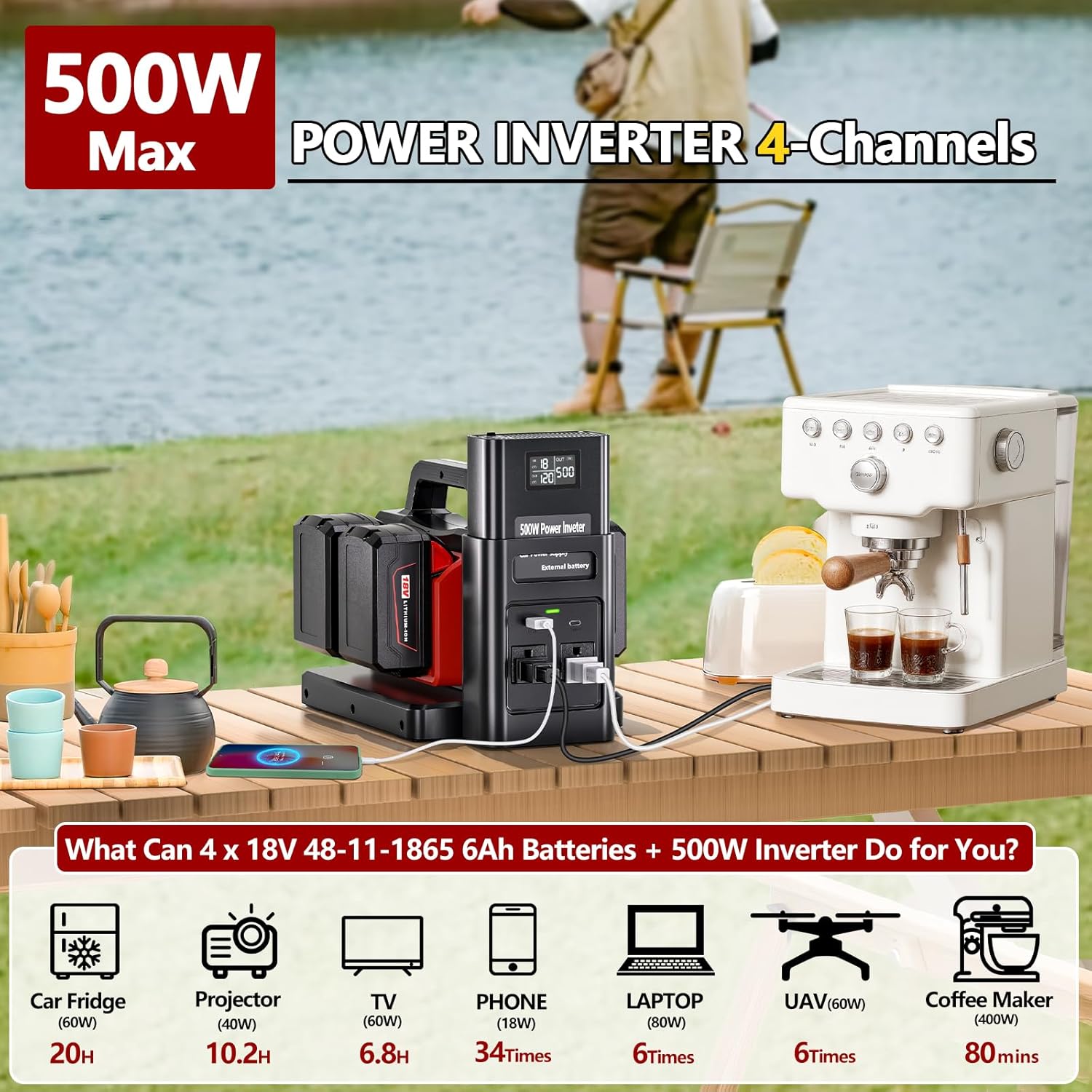 - ⚡500W Pure Sine Wave Power Inverter: Effortlessly power devices like coffee makers, car fridges, TVs, and more with up to 500W output! Compatible with 1-4 Milwaukee 18v M18 batteries—ideal for outdoor adventures, camping, or emergency backup. (Battery not included)
