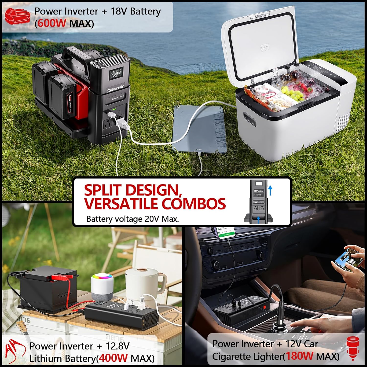 - ⚡Split Design: Can be used separately as a battery charger + car inverter (180W Max).