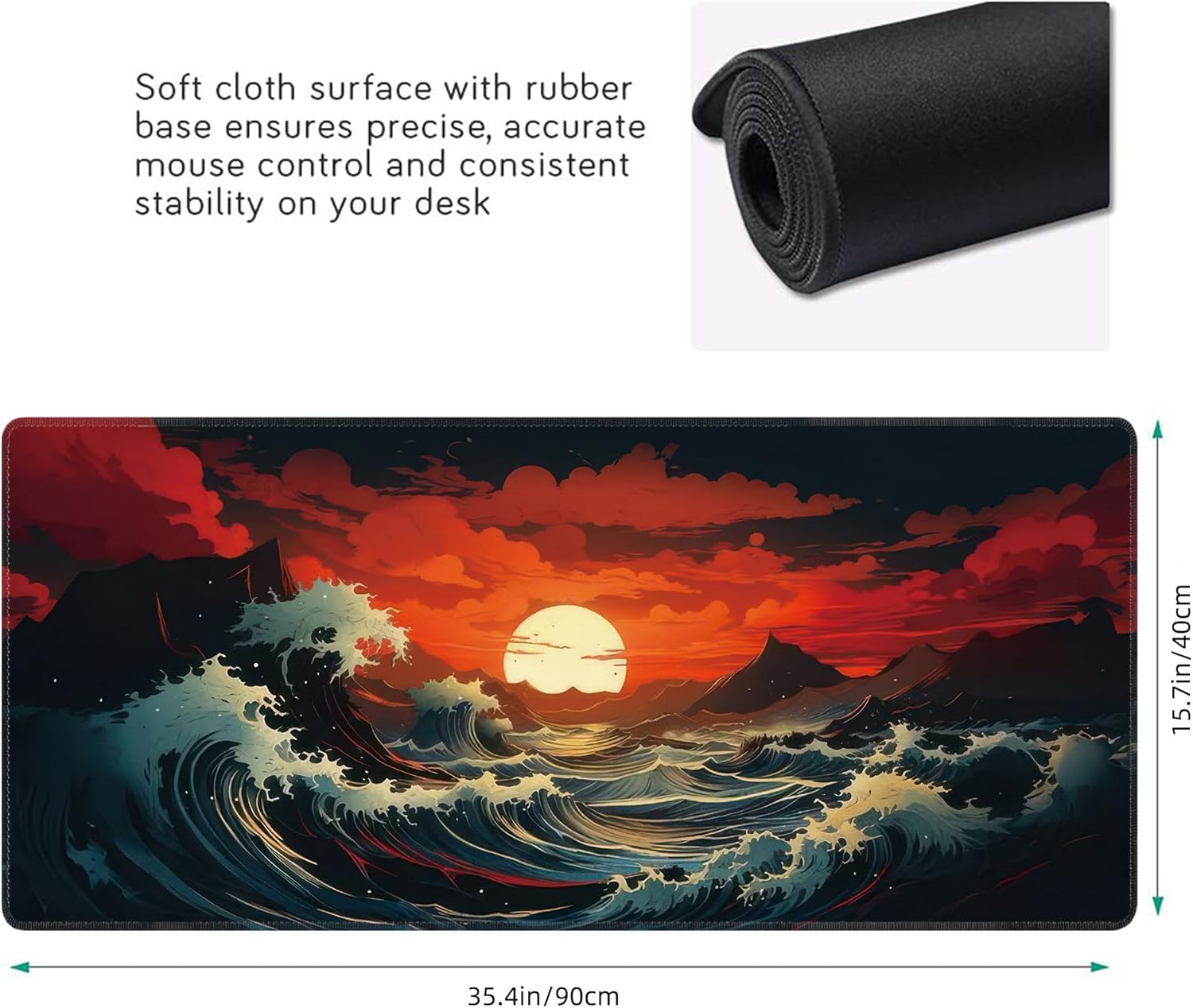 Japanese Sea Wave Large Mouse Pad,Gaming Keyboard Desk Pad,Extended Mouse Mat Non-Slip Rubber Base with Stitched Edges for Office Game Home XXL 35.4"x15.7"