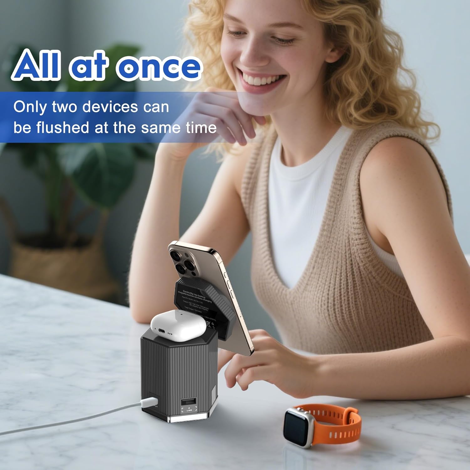 - Upgraded 5-in-1 Wireless Charger: The wireless charger for iPhone is the perfect addition to any desk or nightstand. It allows you to charge multiple devices simultaneously, Designed specifically for iPhone 16e/16/15/14/13/12/11/XS/XR/XS Max/X/8Plus series, iWatch 10/9/8/7/SE/6/5/4/3/2 series, AirPods Pro 4/3/2/1, iPad series and devices with Type-C port and USB port