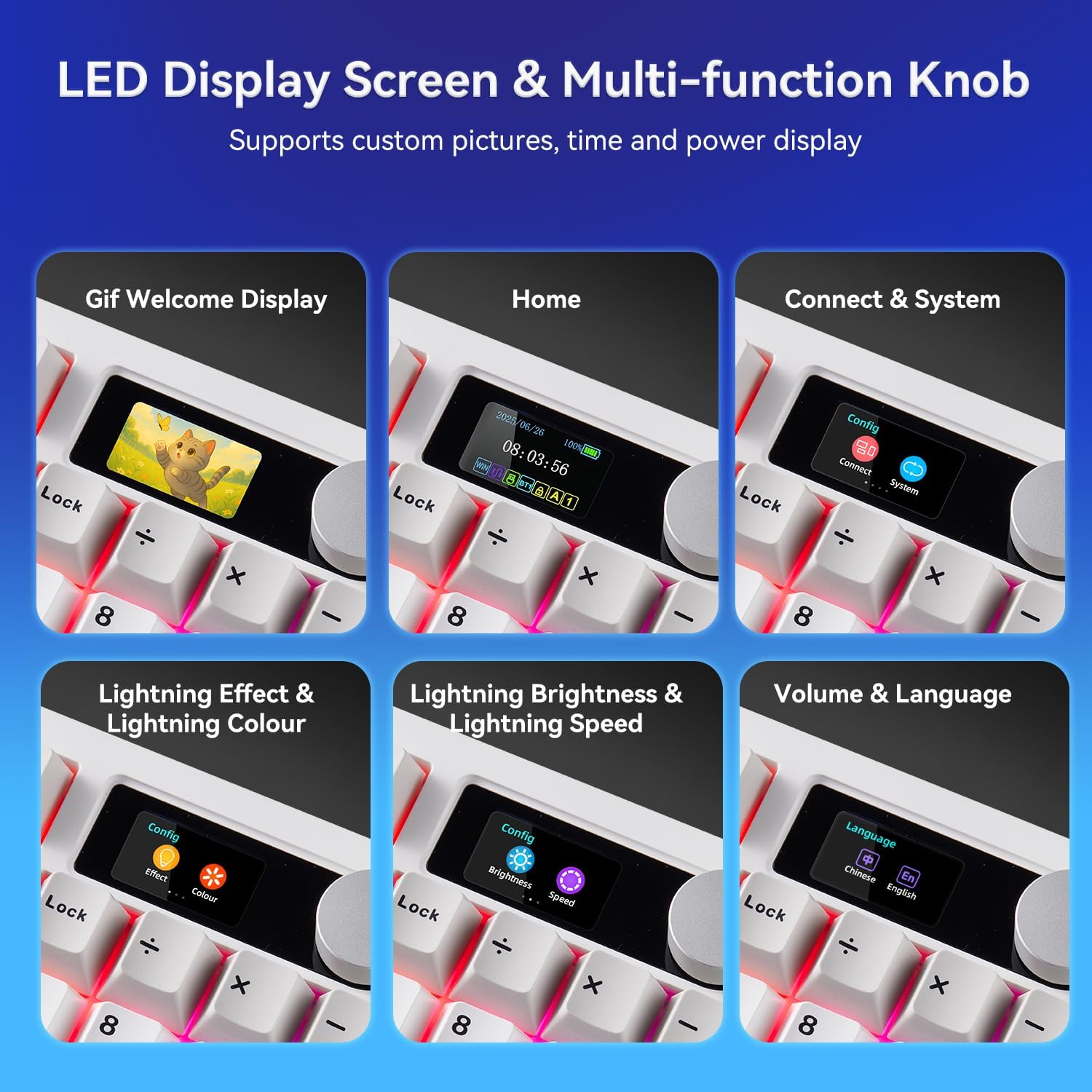 - Intelligent Display Screen & Knob: The Aula F106pro Wireless keyboard has a built-in intelligent TFT colour display screen,. The HD display and multi-function knob are designed to make it easy to switch and update custom GIF images, volume, date and time, battery status, backlighting and connection modes for easier use. (Note: If your device is not a Windows system, you need to download the software under Windows and keep the wired mode to customize your keyboard)