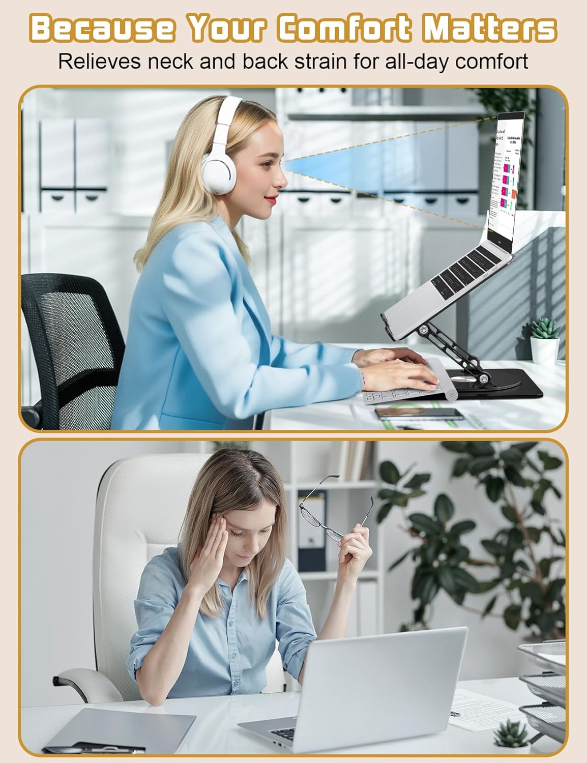 - 【Keeps Your Laptop Cool】Overheating ruining your workflow? Our solid aluminum laptop stand frame isn't just premium—it naturally dissipates heat to keep your laptop cool and running smoothly. And unlike flimsy plastic stands, it's built to last