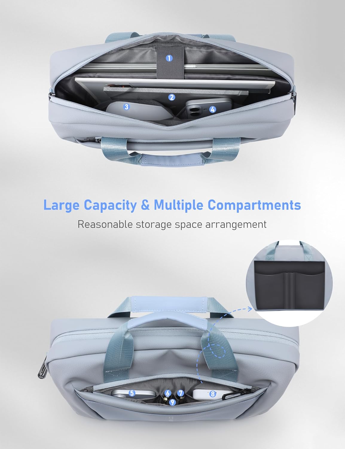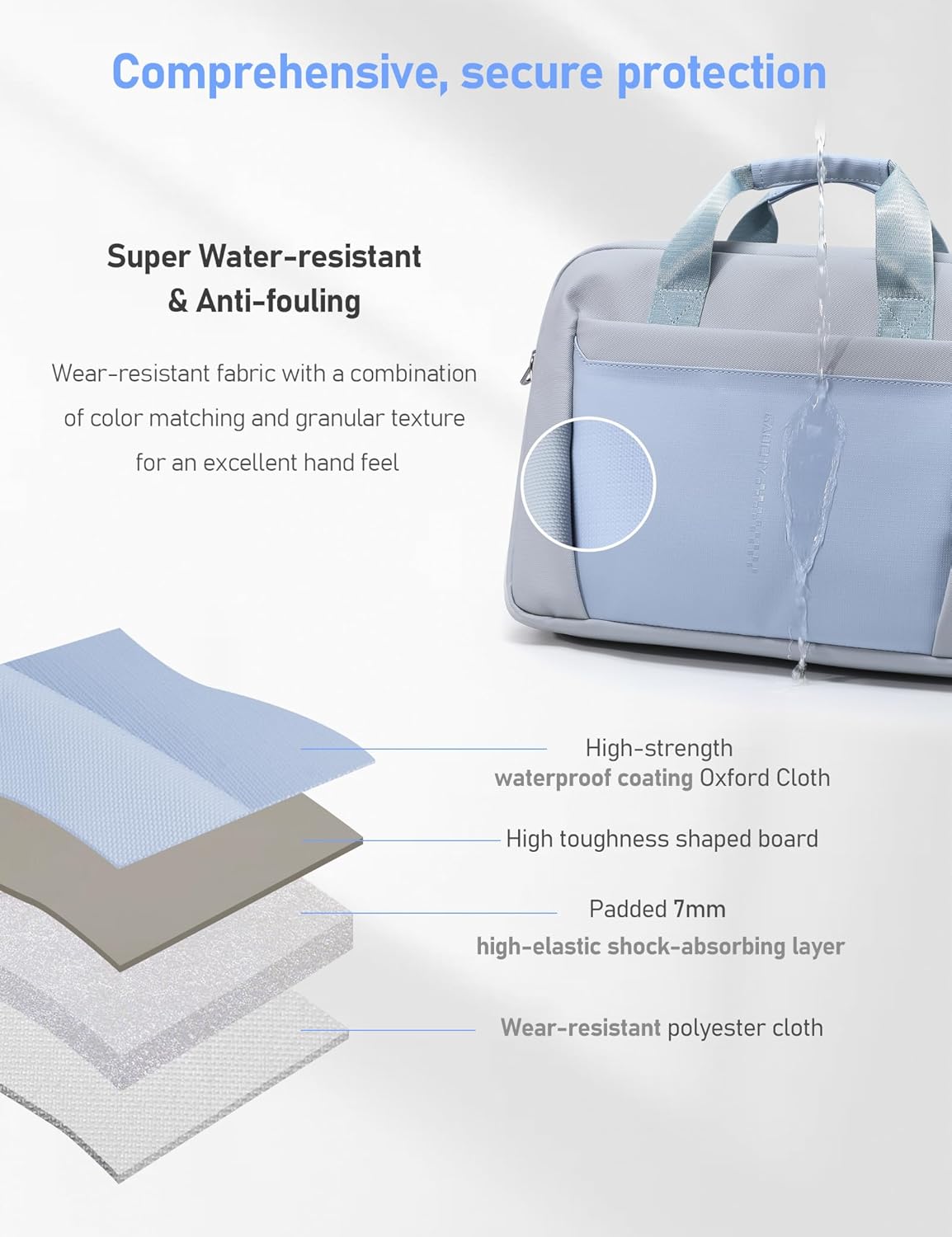 - Superior Protection: It uses high-strength Oxford cloth with waterproof coating, which is super water-resistant, wear-resistant and oil-resistant. The interlayer uses high-elastic shock-absorbing material to protect your laptop and items in all directions