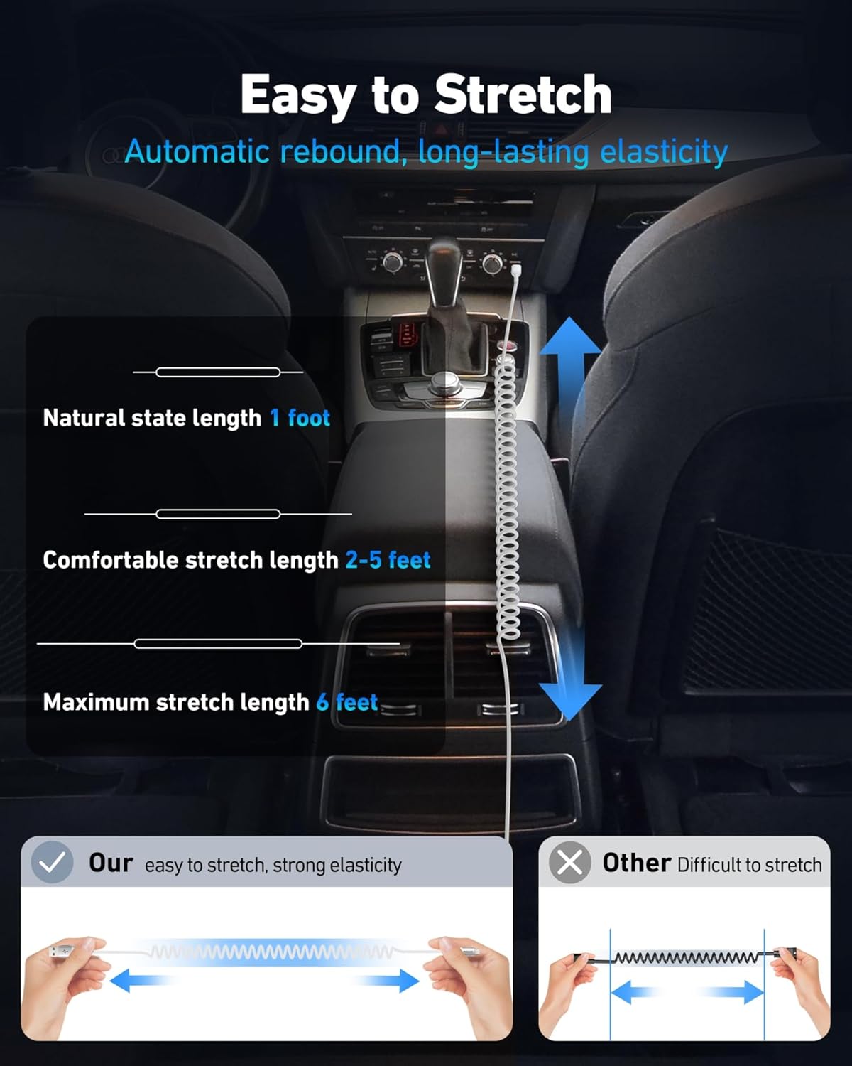 - Stretchable Length and High Flexibility: The natural length is 1 foot, the maximum stretch length is 6 feet, and the comfortable use length is stretched to 2-5 feet, automatically rebounding to the natural state when not in use. The braided cable is made of high-quality nylon, which has better flexibility, wear resistance, easy stretching, fast rebound, and long-lasting elasticity.