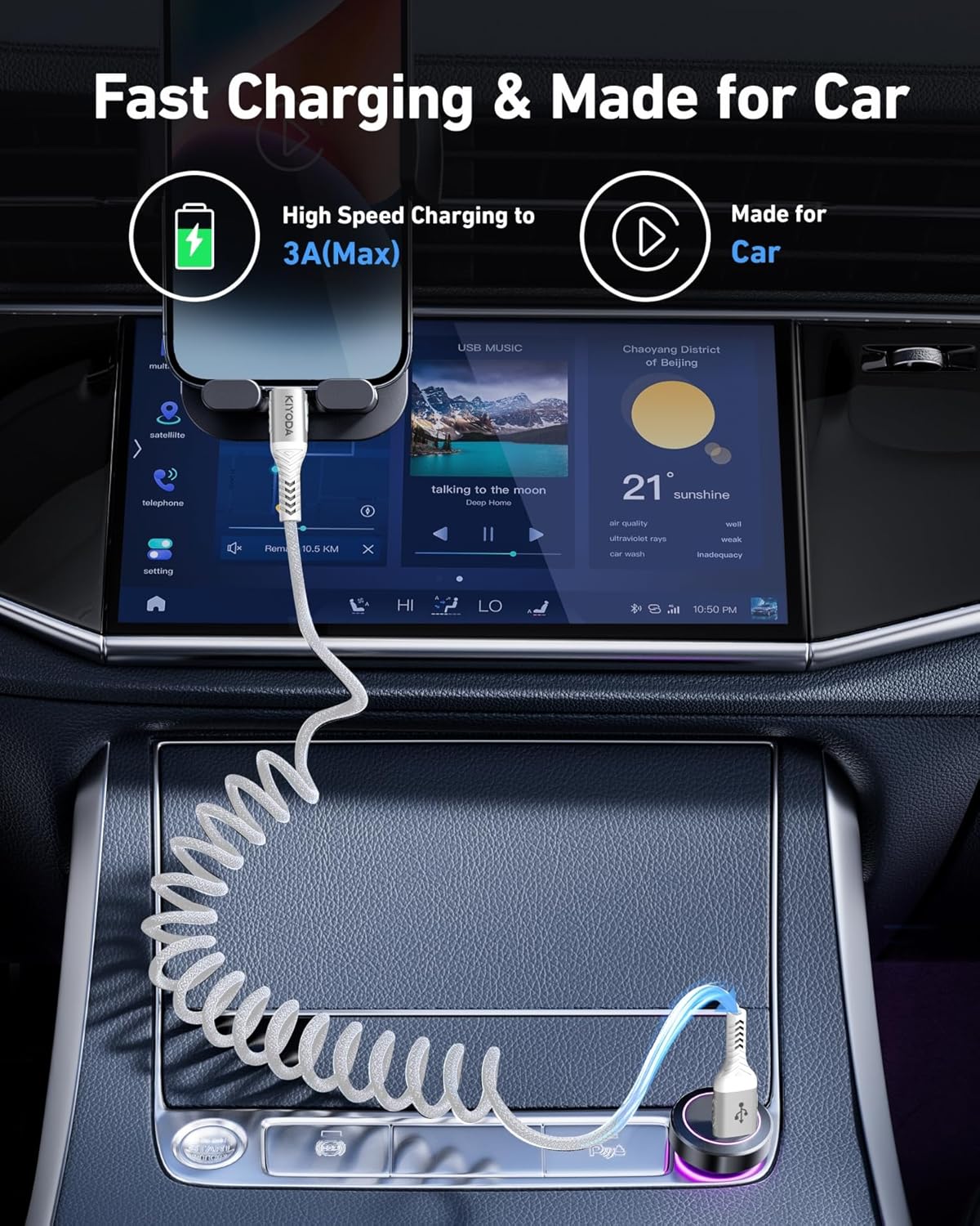 - Coiled USB C Cable: This coil cable is designed with retractable spring design, no tangle, no knot, not taking up space and easy to carry and use. The automatic rebound design for car charging saves space on the center console and avoids clutter. It is perfectly compatible with Apple's CarPlay and Android Auto, with fast charging and data synchronization.