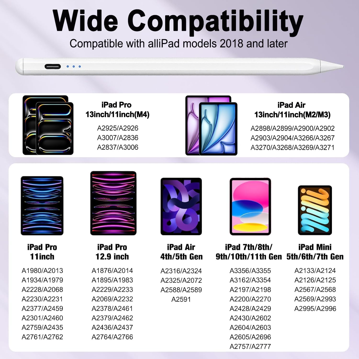 - 【Compatible Model】iPad Pencil is ONLY compatible with ipads released in 2018 or Later. Here are all compatible Model: iPad Pro 13" (M4), iPad Pro 12.9"(3rd/4th/5th/6th), iPad Pro 11"(All Generations), iPad Air M3/M2/5th/4th/3rd Gen, iPad A116/11th/10th/9th/8th/7th/6th, iPad Mini A17 Pro/7th/6th/5th Gen. Please go to Setting>General>About to confirm your iPad's model before placing order.