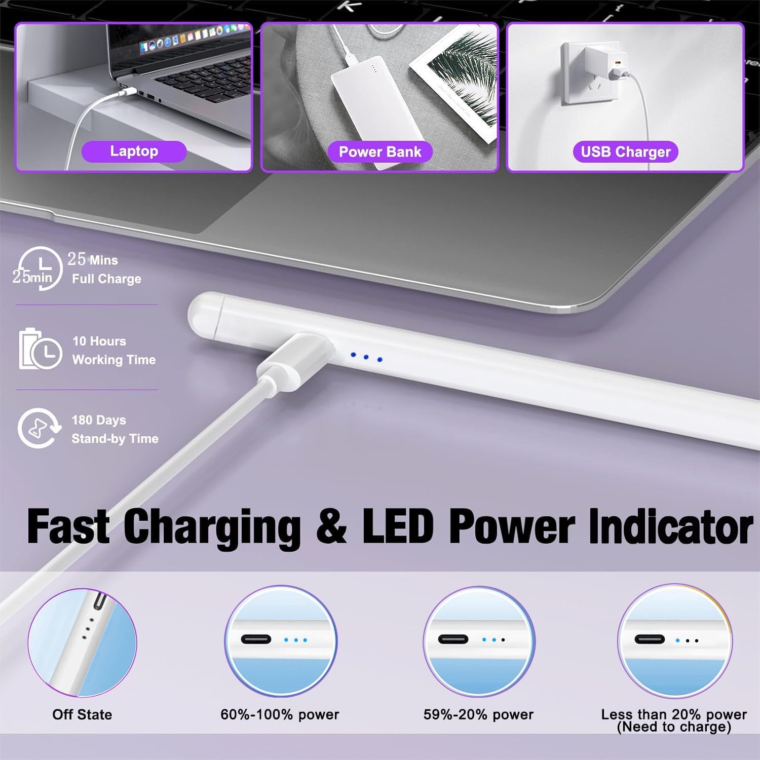 - 【25 Mins Fast Charging & Power Display】Apple pencil charges fully in 25 minutes and allows 10 hours of continuous use. It also auto shuts down after 5 minutes of inactivity to save power.【Triple-Indicator】This pencil for iPad is equipped with a built-in indicator light, with just a glance, effortlessly gauges your pencil's battery life, ensuring you're always ready to create. Power display: three lights on: 60%-100% power, two lights on: 20%-59% power, one light on: less than 20% power.