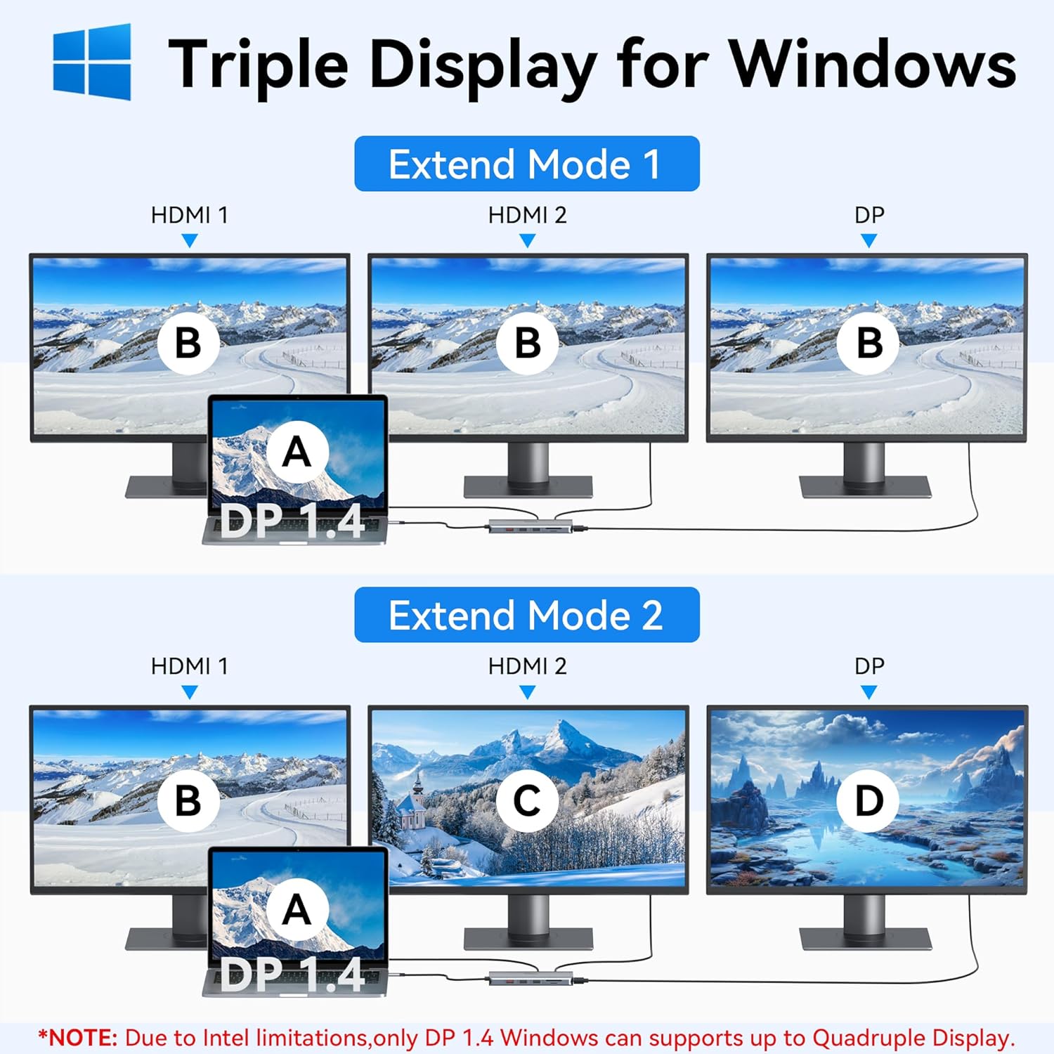 - 【USB C Docking Station Triple Display】This USB C docking station dual monitor connects via a single USB-C/Thunderbolt 3 port, driving 3 monitors (2x 4K HDMI + 1x 4K DP). While single use HDMI 1 port or displayport resolution up to 4K@60Hz, single use HDMI2 resolution up to 4K@30Hz. Dual monitors will be 4K@30Hz and 1080P@60Hz(DP1.4). Triple monitors will be 1080P(DP1.4).Windows supports extended mode via MST/SST; MacOS mirroring only. Ideal docking station for laptop multi-display workflows