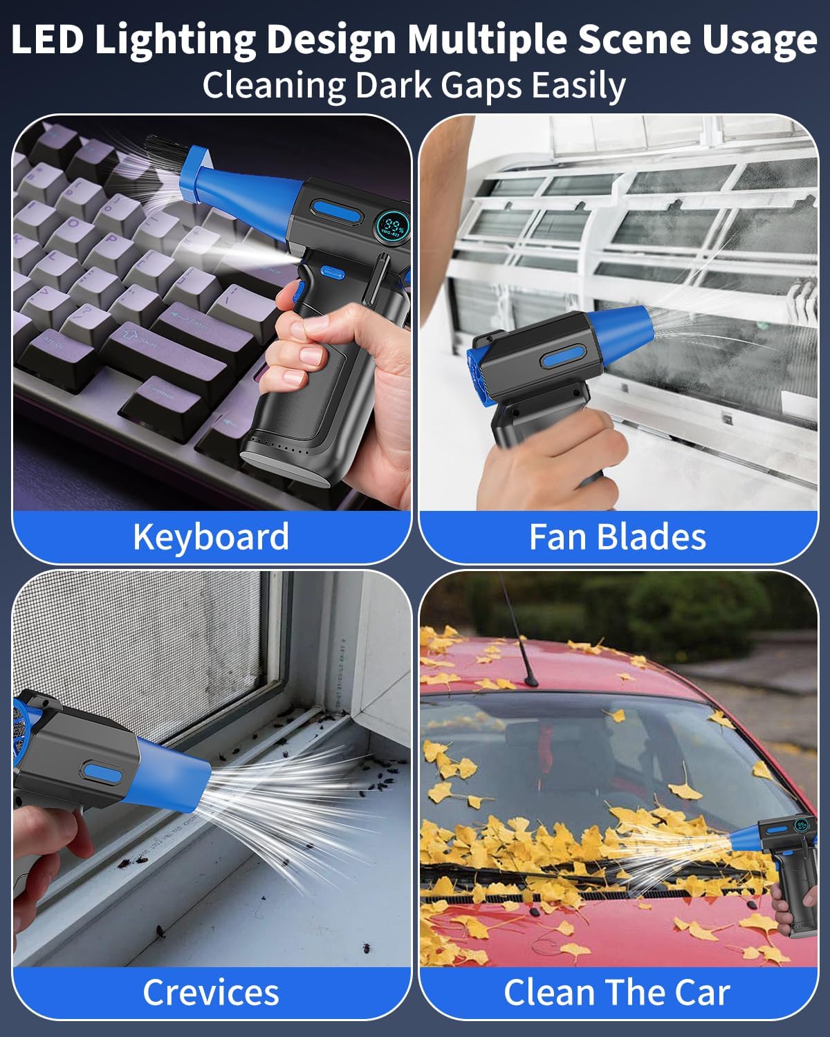 - 【Versatile Cleaning electric duster Tool】The electric compressed air duster featuring an LED light 2 nozzles and 1 brushes, is perfect for cleaning electronics like PCs and keyboards, it possible for you to remove off crumbs, effectively clean different scenarios, as well as for home, car, and outdoor use. It’s also great for inflating gear or managing campfires, making it a must-have for multiple scenarios, to help you effectively complete the cleaning work