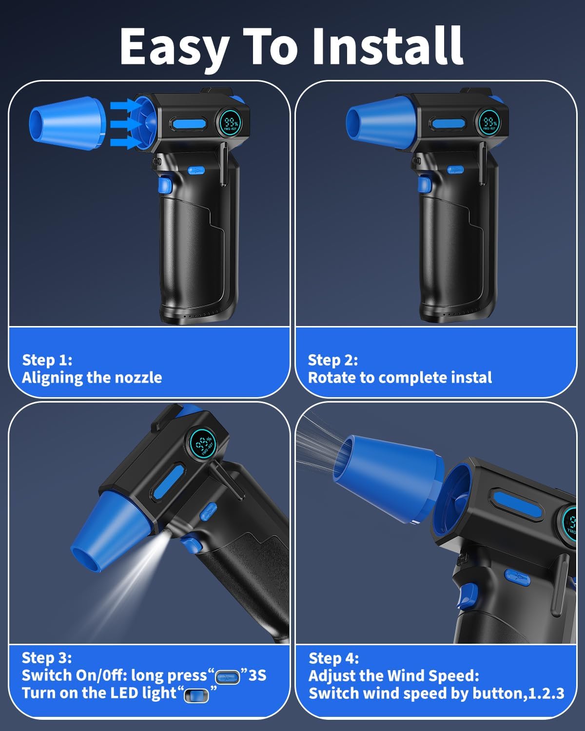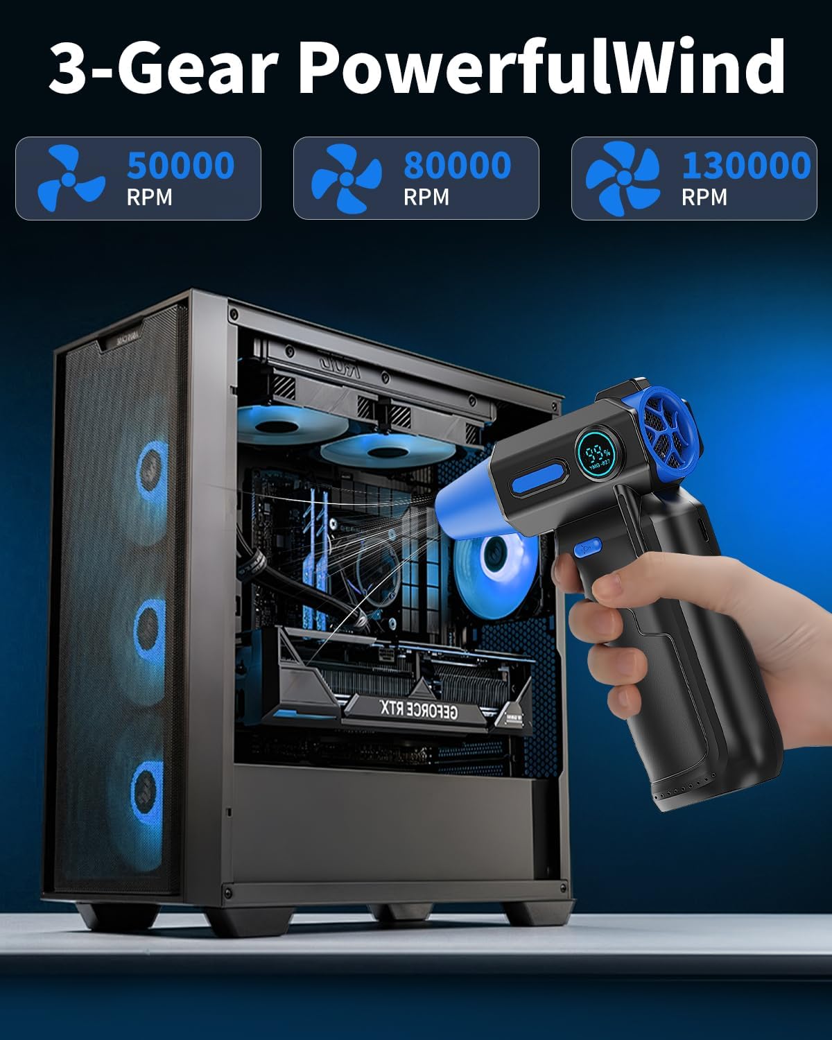 - 【Powerful Compressed Air dsuter】Air dsuter is equipped with a powerful brushless motor, electric air duster delivers impressive speeds of up to 130,000 RPM, generating a maximum wind speed of 45 m/s for efficient dust and debris removal, with 3 adjustable speed settings, it adapts to a variety of cleaning tasks with ease