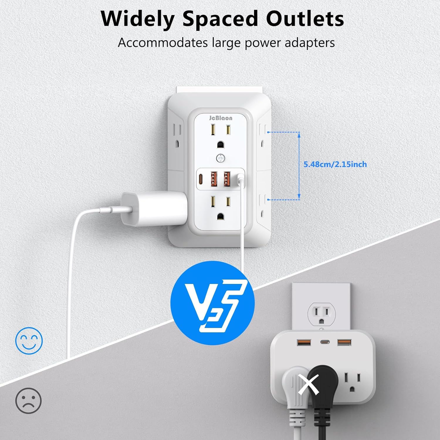 - 【Anti surge socket】This wall socket extender has a surge rating of 1050 joules, which can protect your electronic and mobile devices from voltage spikes. The built-in safety protection function can comprehensively prevent over current, overcharging, and overheating, ensuring fast charging safety.